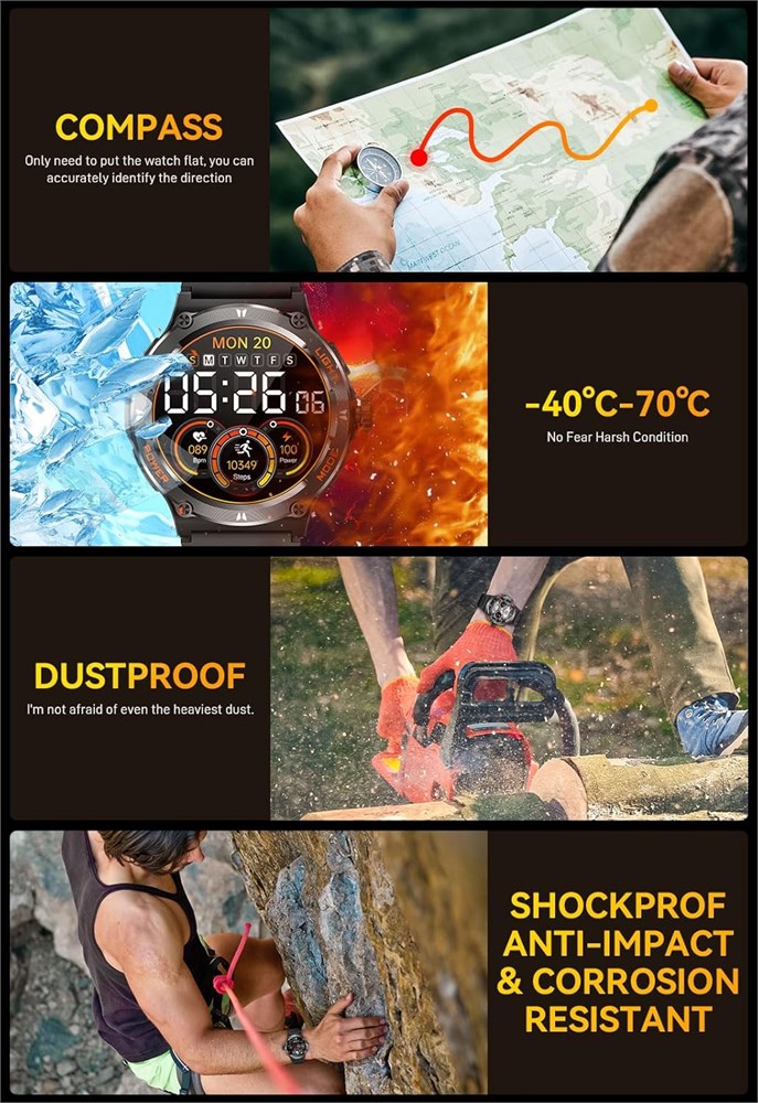 3 Modes LED Flashlight - Dealark military smart watch is rugged and passed multiple military-level tests for extreme temperatures, shock resistance, waterproofing, and dust resistance, making tactical fitness watch the ideal choice for harsh environments. Dealark men's smartwatch is equipped with a side-mounted strong LED flashlight to accompany you through unknown areas without fear of darkness (3 modes: Bright Light, SOS, Flash) with a lighting range of up to 8 meters. 3ATM Waterproof & 500mAh Battery - With a 3ATM waterproof rating, Dealark rugged smartwatch for men can be worn while swimming or outdoors. The iOS Android smartwatch is equipped with a 500mAh battery that supports magnetic charging, offering up to 7 days of normal use and 25 days of standby time. Say goodbye to worries about running out of battery outdoors. 1.53 Big Touchscreen & More Features - Dealark big screen smartwatch for men boasts a 1.53-inch round display with a high resolution of 360x360, offering an enhanced visual and operational experience. Military smartwatch for men features include social media message notifications, LED flashlight, compass, weather, heart rate monitoring, sleep tracking, calculator, sedentary reminders, and more, providing added convenience to your life. Bluetooth Calls & Notifications - Dealark tactical smart watch for men with bluetooth call/notification features a high-quality 5.3 speaker for making and receiving calls. The smart watch with Bluetooth, compatible with iOS and Android phones, seamlessly integrates with popular social media platforms like Facebook and Twitter. Additionally, the smart watch for men features vibration alerts to ensure you never miss important messages and SNS notifications. 100+ Sports Modes & 24-Hour Health Monitoring - Dealark fitness tracker smartwatch supports various sports modes such as walking, running, cycling, and hiking. Bluetooth connected apps record steps, distance, activity time, and heart rate to help you track and improve your performance. The military smart watch for men also supports 24-hour heart rate monitoring and sleep tracking to record sleep time and detect sleep patterns for a healthier lifestyle. Dealark military sports watch for men is compatible with mobile phone versions iOS 10.0 and above Android 6.0 and above smartphones(not for PC, iPad or tablet), supports iPhone, Android, etc.