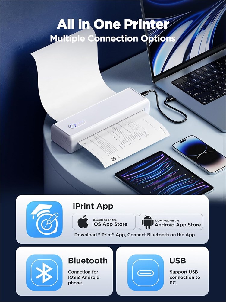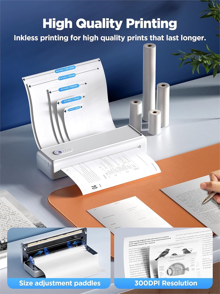 Eco-friendly Inkless Printing: This portable thermal printer eliminates the need for expensive ink, toner, and ribbons. Print recipes, forms, letters, and homework more easily anytime, anywhere. (Note: Only supports thermal paper, not regular copy paper) Convenient and Portable This all-in-one printer combines scanning and printing, fitting easily into any lifestyle. Ideal for office, home, or travel, its compact size and lightweight design make it perfect for professionals, students, and adventurers High Compatibility & Easy Connection The portable printer features Bluetooth and Type-C connectivity options for seamless integration with iOS, Android, and computers. Print easily from smartphones, tablets, or laptops anytime, anywhere (Note: For smartphones and tablets, please install the corresponding APP iPrint . For computers, please refer to the manual to install the corresponding software) Support Multiple Paper Sizes This printer supports various paper sizes: US Letter (8.5"x 11"), 2", 3", 4", A4 roll paper, and A4 folded thermal paper. It can print up to 90 sheets of A4 paper continuously, perfect for labels, receipts, and documents Long Battery Life & Quick Charging Built-in 2000mAh battery offers up to 30 days of standby time for uninterrupted on-the-go printing. Quick Charge technology fully charges the printer in just 3.5 hours, so you're always ready to print when needed.