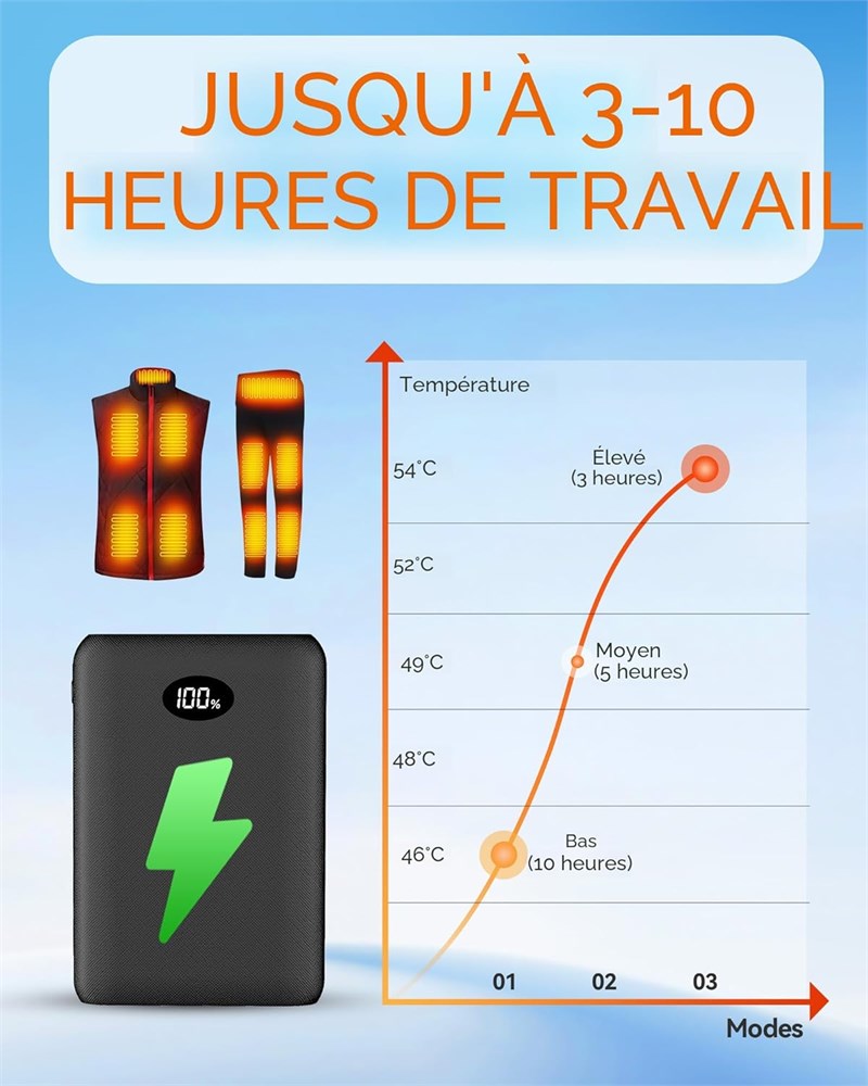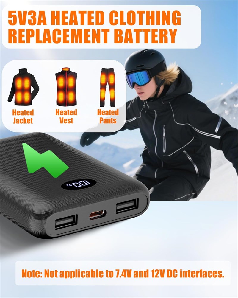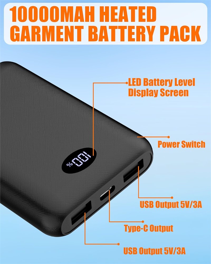 PACK DE BATTERIE POUR V TEMENTS CHAUFFANTS ET PANTALONS Profitez d'une puissance de sortie continue et stable pour vos v tements chauffants avec notre batterie personnalis e professionnellement. Il est s r, fiable et compatible avec une gamme d'appareils chauffants tels que les gilets chauffants, les vestes chauffantes, les pantalons chauffants, les sous-v tements chauffants et les manteaux chauffants. Remarque : pas de port DC, ne convient pas pour les articles chauffants de 7,4 V. Batterie de 10 000 mAh : cette batterie externe dispose d'une capacit de 10 000 mAh, offrant 3 10 heures de temps de chauffage pour vos besoins quotidiens. Profitez de 3 10 heures de chaleur (Haute 130 F/3 heures) - (Moyenne 120 F/5 heures) - (Faible 115 F/10 heures). Il peut galement servir de batterie suppl mentaire, vous permettant de prolonger vos activit s de plein air tout en restant au chaud. Batterie USB et port de type C : dot e d'une entr e et d'une sortie de type C, de ports de sortie USB, cette batterie peut charger votre gilet chauffant et un autre appareil simultan ment. Un cordon USB vers type C est inclus. Conseils : il est fortement recommand d'utiliser un adaptateur de 10 W pour charger la batterie externe, optimisant l'efficacit de la charge. Portable et ultra l ger : cette batterie 5 V 3 A est de petite taille (9,5 x 6,5 x 1,8 cm), super l g re (0,17 kg) et facile transporter. Parfait pour les voyages, ce chargeur portable, ne pesant que 190 grammes, se glisse facilement dans les poches, les sacs, les sacs main ou les sacs dos. S CURIT ET CERTIFICATION UL Notre batterie externe a obtenu la certification UL2056, garantissant la s curit avec des fonctionnalit s telles que la protection contre la surcharge, la protection contre les courts-circuits, le contr le de la temp rature, et plus encore. Il est autoris pour une utilisation bord pendant les vols. Support de la marque Si vous choisissez nos produits et que vous rencontrez des probl mes ou si vous avez besoin de pi ces de rechange, vous pouvez nous contacter via la page de d tails de votre commande Amazon (acc dez Vos commandes > Probl mes de commande > Contacter le vendeur). Nous r pondrons votre e-mail et r soudrons le probl me dans les 24 heures.