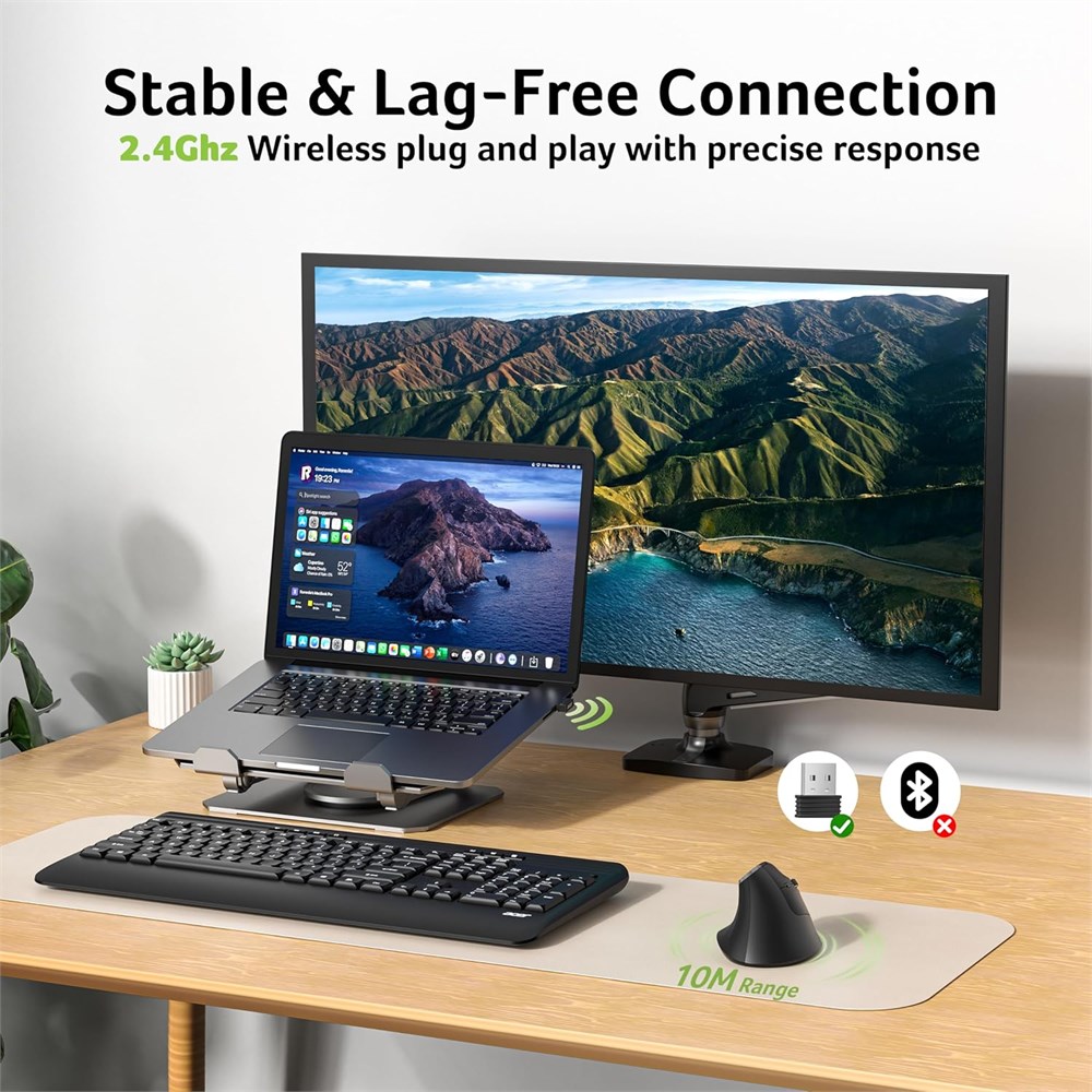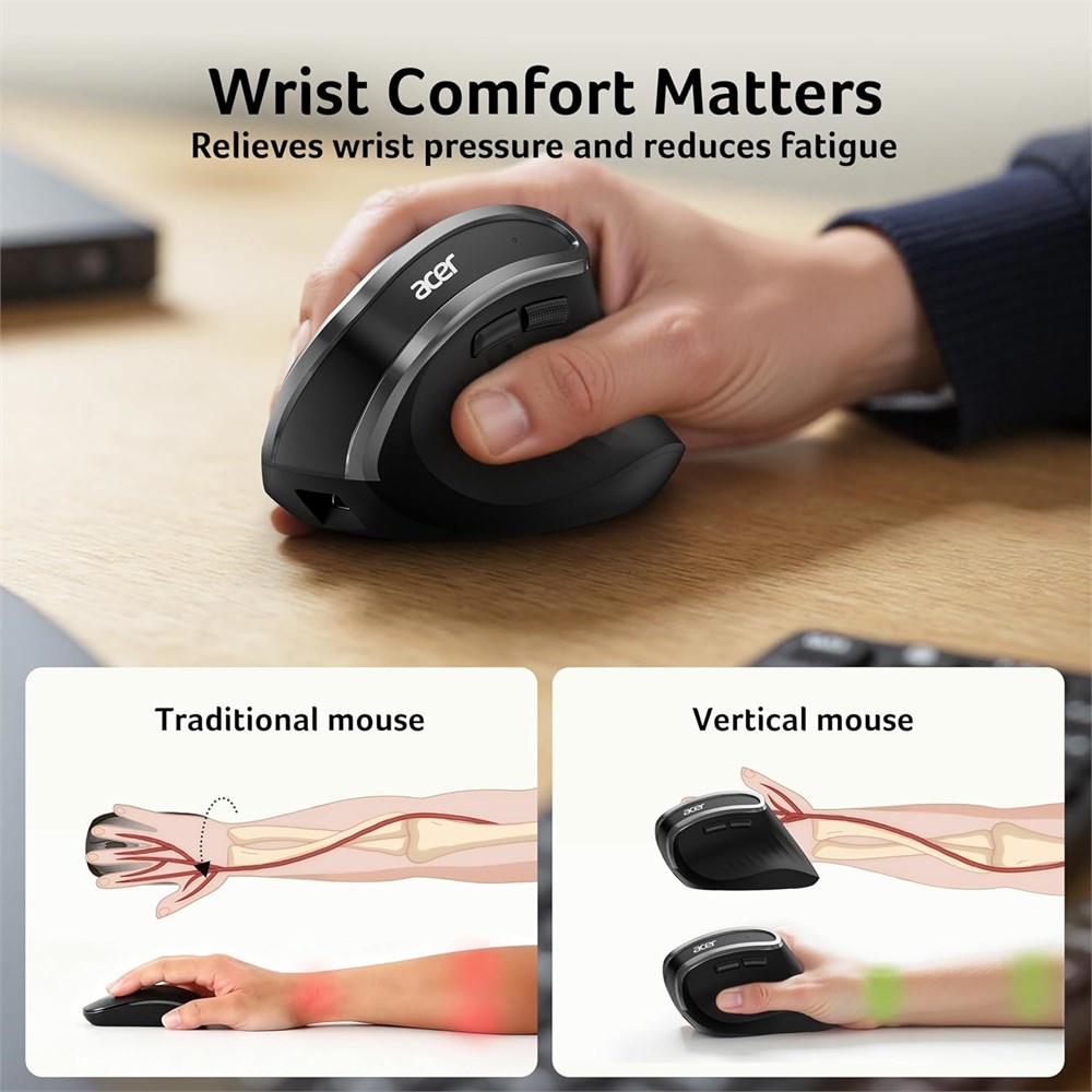 58 Ergonomic Vertical Design The ergonomic mouse Features a vertical structure that naturally contours to your medium to large hand. The 58 tilt angle effectively reduces wrist and arm pressure, decreasing muscle activity by up to 10% for greater comfort during extended use. To reduce fatigue, let your palm rest naturally against the mouse's contour. 2.4GHz Wireless Connection Provides a fast and stable wireless connection via the included USB-A receiver. Plug-and-play setup requires no drivers, with a reliable range of up to 10 meters. NOT Bluetooth connection. High-Capacity Rechargeable Battery Equipped with a 500mAh rechargeable battery, this cordless mouse is designed for long-term convenience. Say goodbye to replacing batteries it's the perfect, hassle-free wireless companion. Precision Control with 3 DPI Settings This mouse for laptop offers three customizable DPI levels (800/1200/1600) ensuring optimal precision for any task. An intuitive visual indicator flashes to confirm your selected DPI setting, making adjustments quick and effortless. If the mouse malfunctions, please press and hold the Left&Right Buttons, and Scroll Wheel simultaneously to re-pair it. Quick Navigation Side Buttons Equipped with dedicated forward and backward buttons, this USB mouse enables rapid browsing and folder navigation. Enhance your efficiency by seamlessly switching applications with a simple click. Side button does not work on Mac. NOTE: 1. The USB receiver stores inside the mouse. 2. The indicator light is flashing rapidly to warn of low battery. 3. Sleeps after 10 minutes. Wake with a double click.