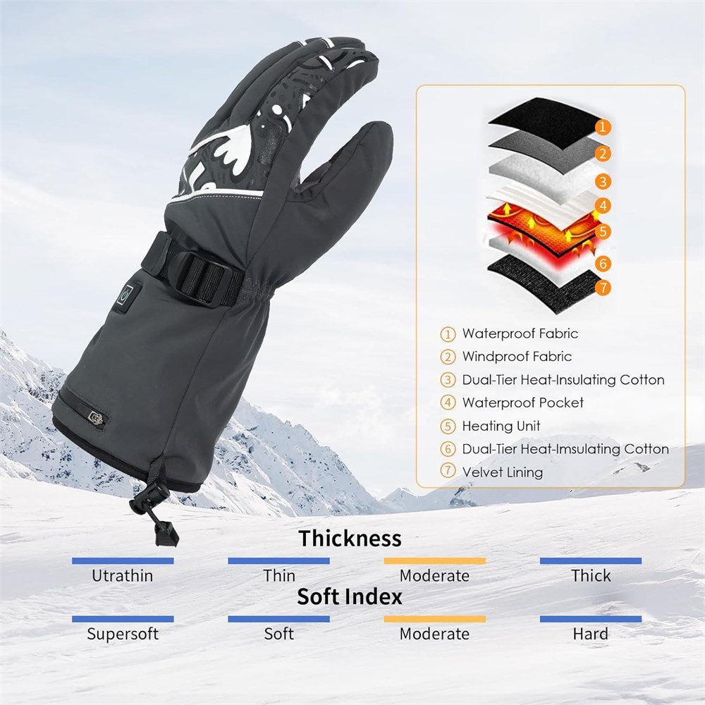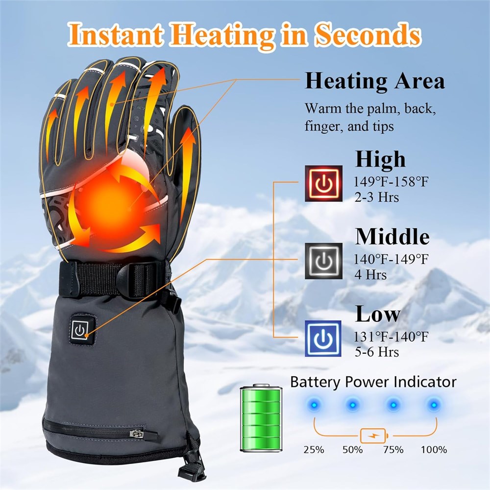 Smart Temperature Control & Battery Indicator The rechargeable hand warmer gloves feature a one-button control with three temperature settings: High (red light, 149 F), Medium (white light, 140 F), and Low (blue light, 131 F). A 4-level battery indicator (100%, 75%, 50%, 25%) allows easy monitoring of remaining power, making operation simple and intuitive. Upgraded Waterproof & Anti-Slip Design Made with a waterproof outer shell, these winter gloves keep your hands dry and warm even in rain or snow. The palm is covered with non-slip silicone material for a stronger grip. Reflective strips on the back improve visibility and safety during nighttime or outdoor activities, very friendly for outdoor workers working in extremely harsh conditions. Longer Lasting Heating & Battery Safer Heated gloves feature dual 5V 5000mAh high-capacity batteries for up to 6 hours of continuous warmth. In just 10 seconds, your hands will warm up. With FCC-certified batteries and integrated safety features against overcurrent, overvoltage, and overcharge, these gloves offer reliable warmth and safety. Touchscreen & Thoughtful Design Heated gloves for men feature highly sensitive touchscreen in the thumb and forefinger, allowing you to use your phone without taking off your heating gloves, which is very practical and convenient. Warmth spreads from the back of the hand to every fingertip, promoting blood circulation and effectively protecting against extreme cold and frostbite. Ideal Choice for Winter Warm gloves are ideal for winter activities like skiing, cycling, hiking, hunting, ice fishing, and for those with reynaud's syndrome and circulation issues. Anti-slip PU material on the palm provides extra grip for driving and cycling, perfect for skiing, motorcycle riding, driving, etc., in cold weather outdoors.