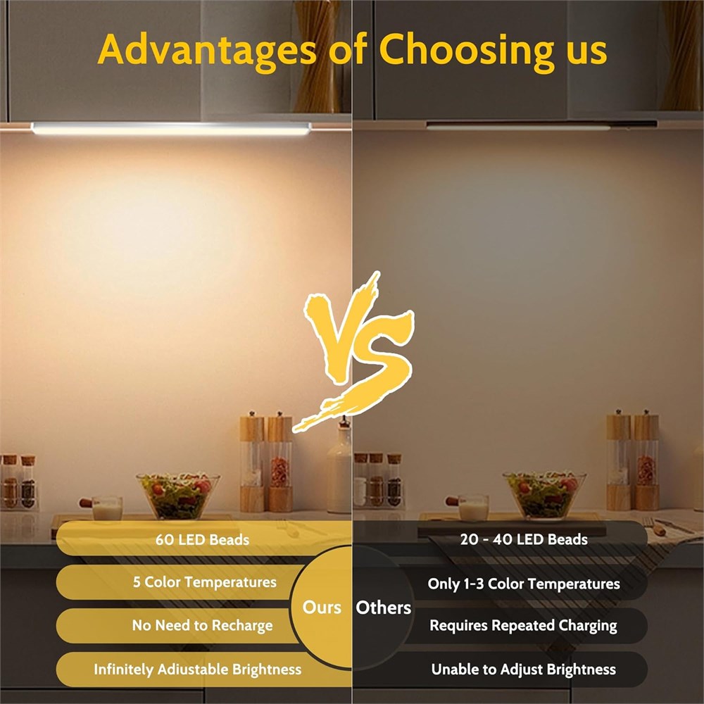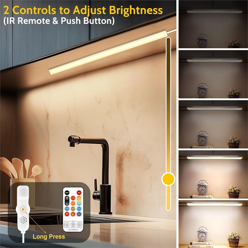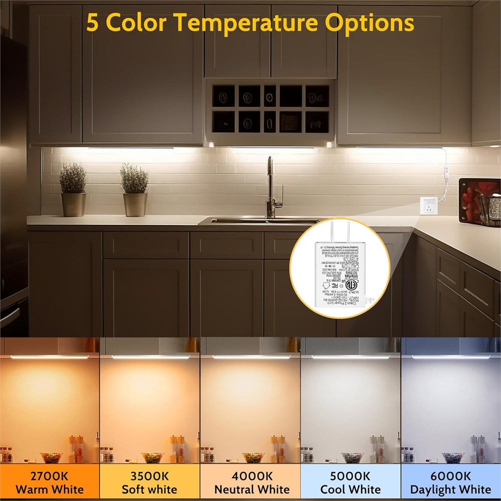 Upgrade your kitchen lighting experience with our Upgraded Under Cabinet Lighting Plug in. Each LED closet light features 60 lamp beads per pack (6 pack total), providing a brilliant 1200 lumens of soft, non-glare light. Crafted from durable aluminum alloy, these lights are built to last. Customize your lighting effortlessly with 2 control methods. Adjust the color temperature and brightness using touch buttons on the controller or the included remote control. Achieve the perfect ambiance with ease. Enjoy peace of mind with our Safety and Energy Efficiency features. Powered by a 24V wall socket supply, this under-cabinet light is double-certified by ETL and UL. It operates continuously for 24 hours, consuming only 0.288kWh, making it both safe and energy-efficient. Installation is a breeze with our Easy Installation options. Choose between double-sided tapes or screws for a secure and quick setup on any surface. Ideal for various locations including kitchen, bedroom, cabinet, closet, workspace, and more. Experience the versatility of our lights with Versatile Use. Whether you need task lighting in the kitchen, accent lighting in the bedroom, or display lighting in a showcase, these lights are designed to meet all your needs with exceptional performance.
