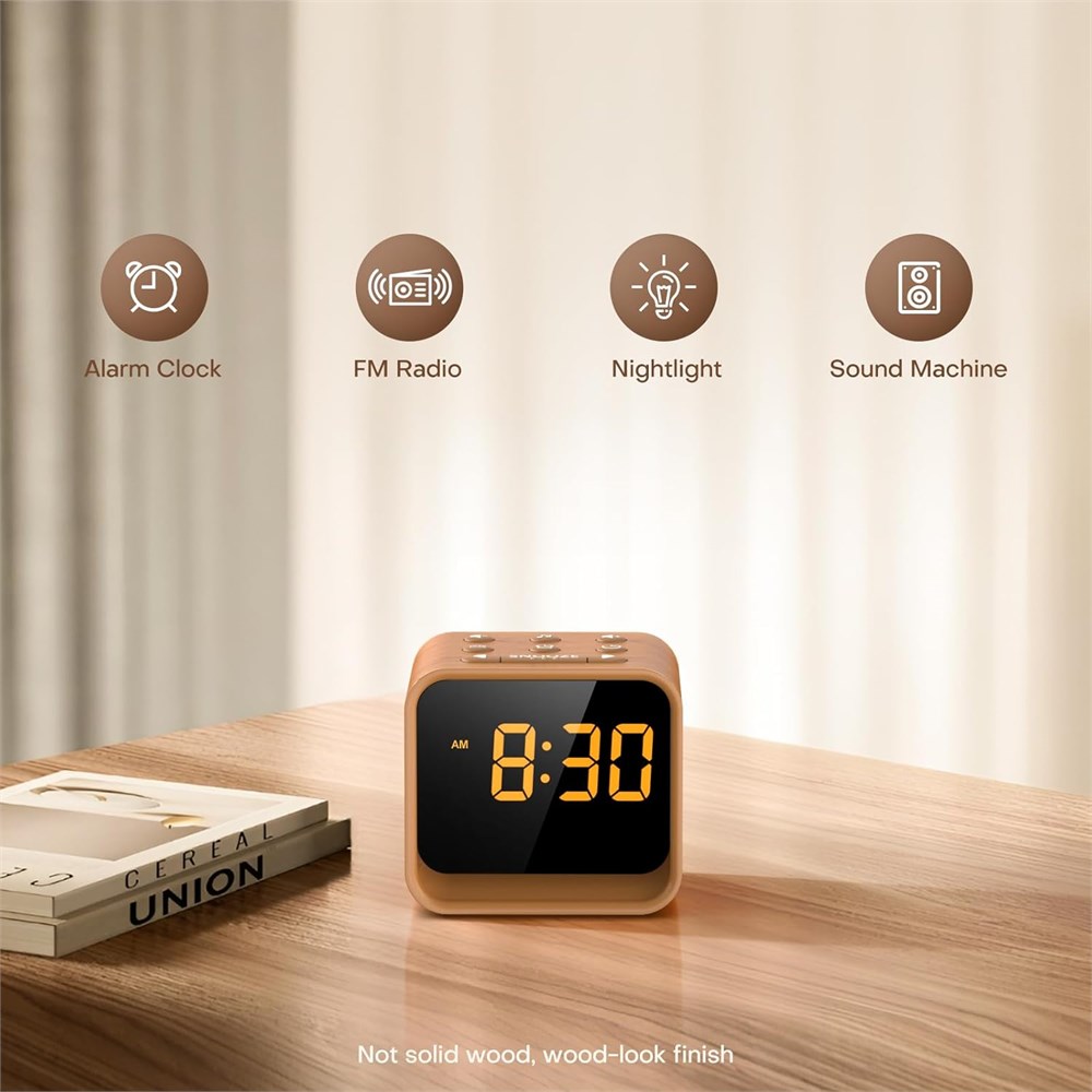 Perfect for Your Bedside Table Transform your bedside experience with our 4-in-1 bedside companion: alarm clock, FM radio, sleep aid and night light. Enjoy unlimited sounds and improve your sleep. Radio Entertainment Enhance your listening experience with our FM radio that delivers clear, high-quality sound. The auto-scan and save station ensures a quick setup for searching stations and allows you to easily pre-select your favorite radio stations. Custom Wake-Up Routine Start your day hassle-free with 9 alarm sounds, including 8 natural sounds (bird, flute, piano, frog, stream, wave, bell, beep) and also your favorite FM radio. A convenient 9-minute snooze option and 20-105dB volume control provide a gentle and gradual wake-up experience tailored to your taste. Soothing Sleep Buddy Immerse into dreamy sleep with 24 soothing sounds, from calming nature tones (rain, fan, wave, etc) to diverse white noise (3 white noise, brown, pink, blue noise), creating a personalized and peaceful ambiance for a restful night's sleep. Dimmable Display & Ambient Nightlight Clear face with 0-100% full range brightness control, this clock is very easy on the eyes day and night. Plus, enjoy the 7-color night light at the bottom perfect for cozy sleep vibes or matching your style effortlessly.
