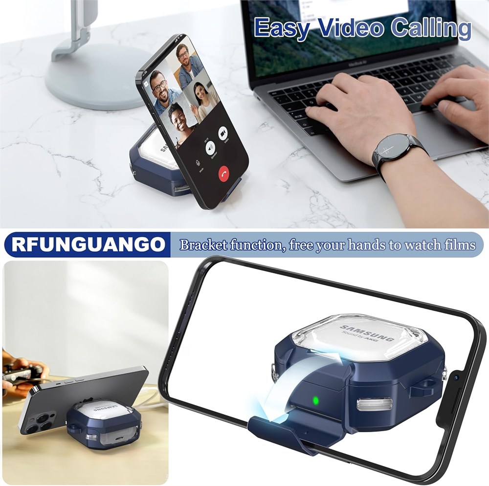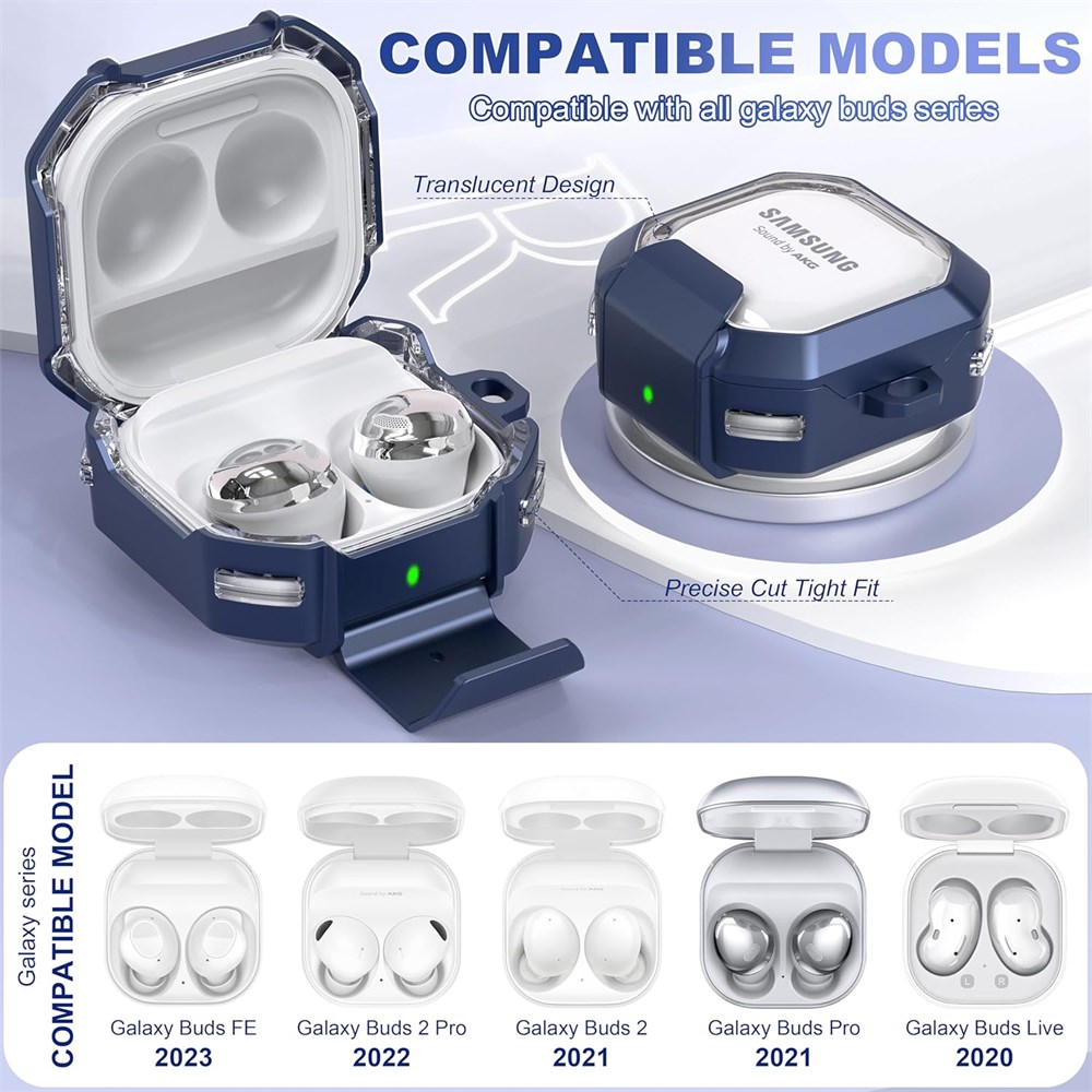 Upgraded high-transparent model: While having both lock design and stand function, it uses Bayer's advanced TPU material to create a more perfect Samsung protective case, which you will love in terms of appearance and function. MATERIAL AND PROTECTION: The headphone cover is made of rugged, military-grade, hard PC material, with four corners wrapped in a double-layer air cushion structure. Angle cushioning technology protects your Galaxy Buds Live/Pro/2 charging case from bumps, drops, scratches and more. UNIQUE DESIGN: After opening the latch, the latch can be used as a mobile phone holder, freeing your hands anytime, anywhere. Compatible Models :The security locks case covers specially designed for Samsung Galaxy Buds2 Pro (2022 ) /Galaxy Buds Pro (2021) / Galaxy Buds 2 (2021) / Galaxy Buds Live (2020) wirless earphone. Not compatible with Galaxy Buds (2019) and Galaxy Buds Plus (2020). Cleaning Kit: one-piece cleaning pen design - one side pulls down for the open cleaning brush, the other side pulls down for the plush brush bristles and round metal tip; convenient dual-ended hidden design, the cleaning pen can meet the cleaning needs of a variety of occasions.