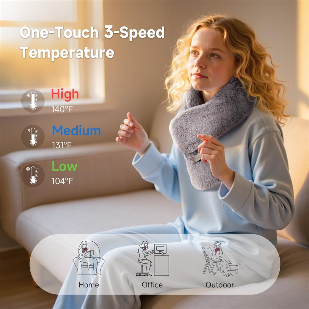 Comfortable and Intimate Design: Our Electric heating scarf is crafted with premium faux rabbit fur fabric, offering a luxuriously soft, skin-friendly feel. Experience ultimate comfort while enjoying soothing warmth. The size is 35.5x 4.3 inches with constant temperature heating, the heating scarf serves as a good choice for achieving complete mind-body relaxation. 3 Adjustable Heat Levels: This heated scarf offers three adjustable heat levels to cater to diverse warmth needs. Featuring one-touch switching design for effortless adjustment, the electric heating scarf delivers personalized warmth whether for daily commutes or outdoor adventures. Wireless and Convenient: This wireless heated scarf is equipped with a 4000mAh high-capacity battery, combining safety with long-lasting performance. Its lightweight, portable, and stylish design ensures worry-free warmth wherever you go. Easy to Clean: Keep your heated neck wrap cozy and tidy! It's washable, Just detach the power bank and toss it in the washing machine. Make sure to dry thoroughly before reusing for lasting warmth and freshness. Perfect Winter Gift: The heated neck warmer is an ideal gift. It s a thoughtful present for birthdays, Valentine's Day, Father's Day, Christmas, Thanksgiving, and more. This cozy heated scarf give the soothing relaxation and watch their stress melt away.