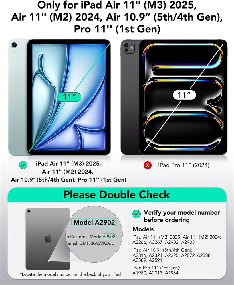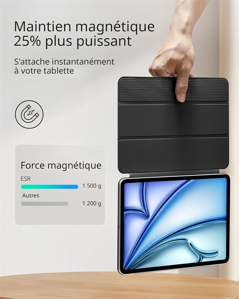 Compatibilit : uniquement pour l'iPad Air 11" M2 (2024), l'iPad Air 5e/4e g n ration et l'iPad Pro 11" (1 re g n ration, 2018); mod les : A2902, A2903, A2588, A2589, A2591, A2316, A2324, A2325, A2072, A1980, A1934, A2013, A1979, non compatible avec tout autre mod le d'iPad Fixation magn tique puissante : des aimants puissants assurent un verrouillage solide entre l' tui et la tablette Durable : fabriqu e avec des mat riaux de haute qualit pour une utilisation prolong e et un aspect plus neuf qui dure Prise en charge du stylet Pencil Pro et du stylet avec port USB-C : cet tui pour iPad Pro prend enti rement en charge le stylet Pencil Pro avec une rainure lat ral encastr e pour la charge magn tique et un fermoir magn tique pour maintenir votre stylet en toute s curit Mince et stable : conception l g re pour une portabilit facile,et couverture avant pour des positions stables d di es au visionnage, la frappe et au dessin.