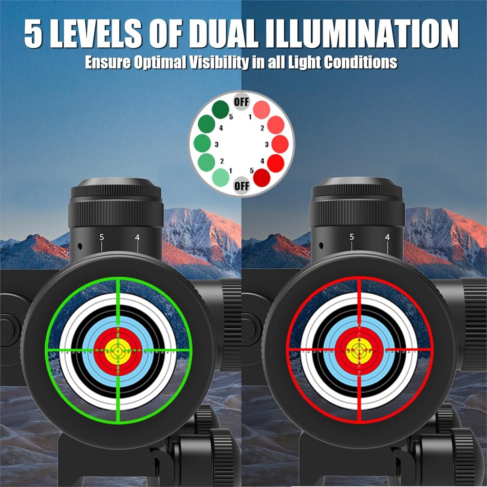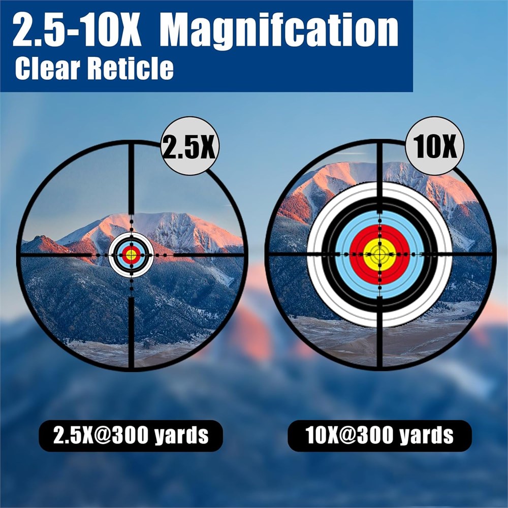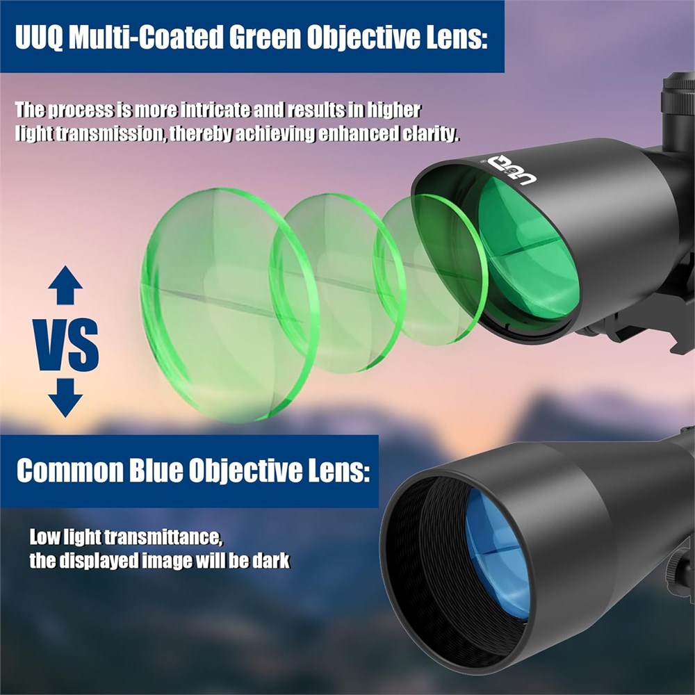 Magnification and Red/Green Laser 2.5-10X with 40mm objective; Field of View:100 yards of 32.5' @ 2.5x - 8.9' @10x; Laser Power: 2mW, Laser Class: Class IIIA. extended range in bright lighting conditions, while also performing exceptionally well in low-light environments. It provides outstanding precision and target acquisition capabilities. It has a range of over 300 yards. Upgraded Multi-coated Green Lens and Clear The multi-layer green coating of the UUQ 2.5-10x40 rifle scope provides a bright, clear, and vivid view, making targets easy to identify. It reduces light scattering and reflection, ensuring image clarity and maintaining clear visibility of the range. Whether in bright or low-light conditions, it performs exceptionally well. Durable construction The UUQ 2.5-10x40 rifle scope, constructed from durable aircraft-grade aluminum alloy, offers vibration resistance and is well-suited for hunting. With a floating design and superior waterproof and fog-proof performance, it ensures reliable functionality without the need for frequent maintenance or replacement in any environment. Illuminated Mil-Dot Reticle and Versatile Weapons The UUQ 2.5-10x40 rifle scope has five levels of red and green brightness, providing clear long-range shooting with excellent optical performance. It is equipped with two top-quality, 1-inch complementary rings, making it easy to install on any 20mm Picatinny or Weaver mounting rail, and can be used with various firearms. Packaging The package includes a 2.5-10x40 rifle scope, 2.5-10X40ER:lens covers, CR 2032 x 1 Included LR1130 x3 laser) cleaning cloth, wrenches, and user manual.