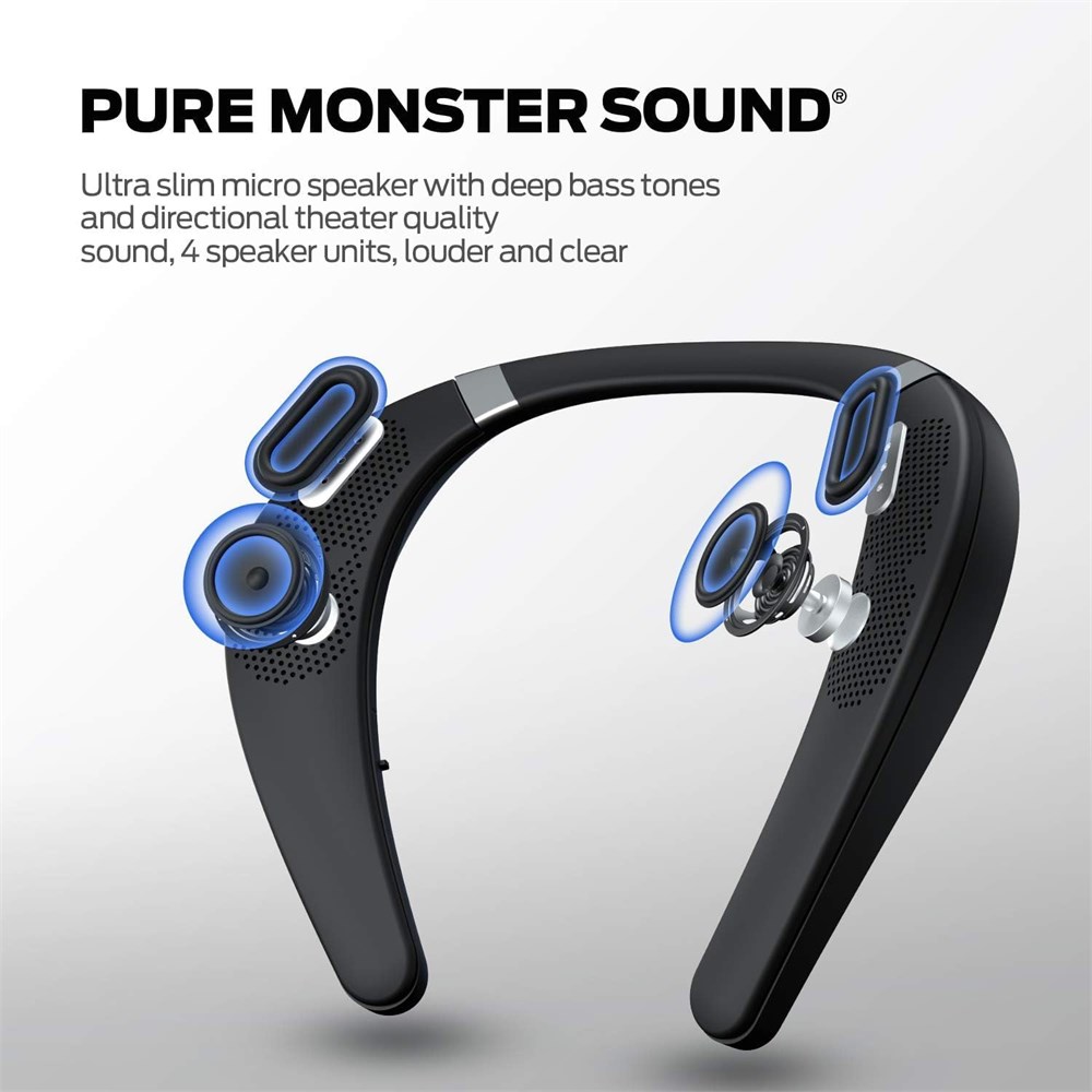 Pure Monster Sound & 3D Theater Experience The Monster Boomerang Neck Speaker is designed and engineered by Noel Lee and the Monster Design Team in the USA with quality components that deliver best-in-class performance with zero distortion at any volume. With the Qualcomm chip and apt-X high-tech which is designed to enhance and reproduce perfect 3D stereo audio quality. Built-in 3W speaker system and 2 bass diaphragms, creating a truly unique and pure Monster sound experience. 12H Long Playtime & Safety Awareness With up to 12 hours of battery life, you can have the playlist going all day. Enjoy great music with the freedom of portability without the fuss of entangled power cords. It doesn't seal around or even touch the ear canal, It allows you to listen to your favorite audio and still be able to hear other pedestrians, passing cars, and anywhere you need to hear ambient noise. Always stay connected to the world without worrying about missing cues around you. Ergonomic Design & Lightweight & Comfortable The Monster Boomerang Neckband bluetooth Speaker is based on ergonomic design, once you put this wearable speaker around your neck, you ll hardly know you re wearing it, weighing only 0.46 lb (216 g), and you ll never feel a burden by leaning lightly on the shoulder. Stay comfortable for listening all day. Hands-Free Calls & Upward-Facing Sound Precise voice pickup technology implemented in Monster Boomerang neck speaker, optimally and performs advanced audio signal processing to pick up your voice clearly and precisely for hands-free calls and Speak-to-Chat detection. Besides, this neck speaker built-in audio upward-facing function, delivers sound directly to the ears without disturbing others, creating a private personal music zone with a full range of deep bass. Fast Connection & IPX7 Waterproof Monster wireless neck speaker adopts Bluetooth 5.0 technology and enjoys 2 times the transmission speed, no signal loss or music interruption. Compatible with any Bluetooth-enabled devices, including smartphones, computers, and TVs. Featuring IPX7 waterproof,can fully submerged in 3.3 feet of water for up to 30 minutes. So there is no need to worry when using it by the sea, in the pool, on a boat, or in a shower room.