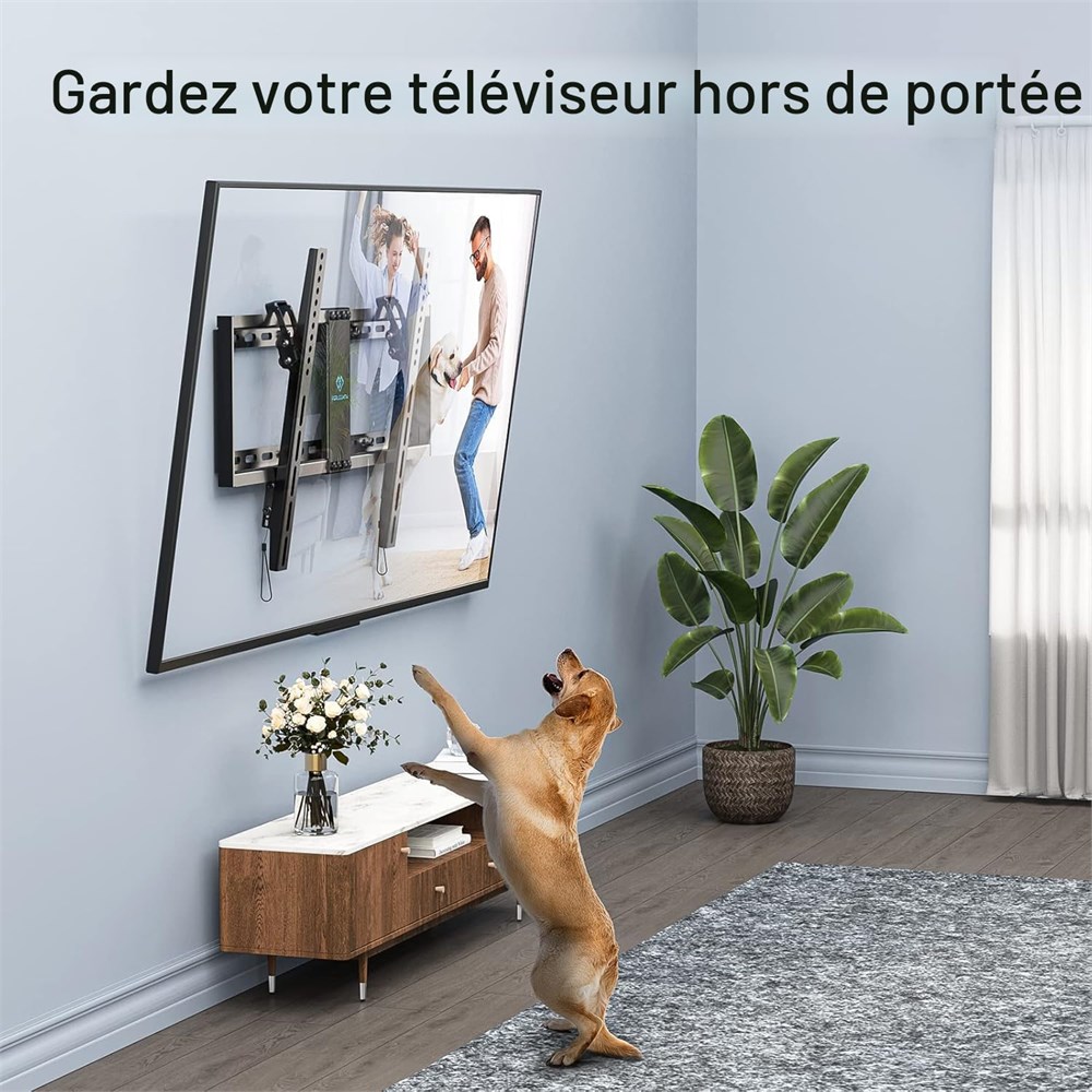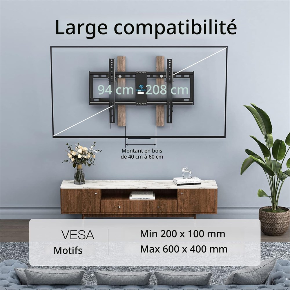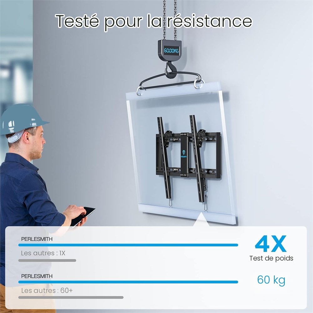 Large compatibilit : ce support mural inclinable pour TV est compatible avec la plupart des t l viseurs de 37 82" jusqu' 60 kg avec des motifs VESA de 200 x 100 600 x 400 mm. Veuillez v rifier la taille de l' cran, le poids et le mod le VESA de votre t l viseur avant l'achat. Construction en acier massif : le support mural Perlesmith pour TV fabriqu en acier de haute qualit garantit la s curit , ce support TV de 65 pouces a des normes lev es, qui est test pour supporter 4 fois le poids auquel ils sont valu s selon la norme, il dispose d'un m canisme de verrouillage avec lib ration rapide qui s curise facilement la t l vision au mur. Minimisez l' blouissement : dites adieu aux reflets irritants en inclinant votre cran de 7 degr s vers le bas vers votre position de visualisation. Vous pouvez galement d placer votre t l viseur avec les supports muraux inclinables gauche ou droite sur la plaque murale pour un centrage parfait sur votre mur. Design peu encombrant : ce support mural inclinable profil bas maintient votre t l viseur seulement 3 cm du mur pour un look discret qui conomise de l'espace. Pour plus de commodit , les supports ont des m canismes de verrouillage int gr s pour enlever ou s curiser votre t l viseur facilement. Installation facile : accrochez votre t l viseur comme un pro. Le support mural TV de 75" peut tre install sur des clous en bois de 40,6 cm/45,7 cm/24", du b ton ou des murs en brique. Les m canismes de verrouillage du cordon de traction int gr s permettent de verrouiller ou de lib rer rapidement votre t l viseur de la plaque murale.