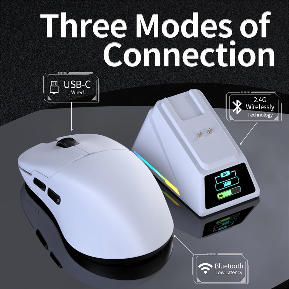 AJAZZ AJ159 APEX Cette souris de jeu ergonomique sans fil est personnalis e pour une performance am lior e en utilisant le dernier capteur PAW3950 pour offrir la meilleure pr cision et pr cision pour les jeux comp titifs rapides, offrant jusqu' 42 K DPI programmable, 8000 Hz/0,125 ms, vitesse IPS 750 et acc l ration de 50 g. Faites passer votre exp rience de jeu au niveau sup rieur. Station de charge magn tique : la souris sans fil pour PC AJ159 APEX est livr e avec une station de charge magn tique et un r cepteur 8K int gr , une interaction couleur innovante RVB, un cran TFT int gr pour afficher visuellement l' tat de la souris, y compris l'image GIF en mode sans fil, LOD, DPI, taux d'interrogation, niveau de batterie, date et plus encore. Charge rapide pour une longue dur e de vie de la batterie. Design ultra l ger de 56 g et rev tement sensible la glace : l'AJ159 APEX ne p se que 56 grammes et est con u pour le confort et la vitesse. Gr ce un design soign et un processus innovant de moulage par injection refroidi l'azote liquide, une coque plus fine et plus l g re est obtenue tout en maintenant la r sistance. Trois modes de connexion : la souris de jeu personnalis e prend en charge le Bluetooth pour une connexion facile; sans fil ultra haut d bit 2,4 GHz pour les jeux sans d calage; USB-C filaire pour le chargement lors de l'utilisation. Vous pouvez utiliser le logiciel puissant pour attribuer des macros, remapper les fonctions des boutons, red finir DPI, LOD, r gler le taux d'interrogation et le mode de personnalisation de la base de charge, surveiller l' tat de la batterie et plus encore. Plus de 100 millions de clics et pieds ETFE : gr ce la configuration du micro-interrupteur vert translucide Huanuo, la pr cision est aussi rapide que l' clair, clics nets pour am liorer le contr le du jeu, chaque bouton a t test avec plus de 100 millions de clics ; pour am liorer la r sistance l'usure et la stabilit , le fond des pieds en t flon pur, pour garantir que le mouvement est plus rapide et un meilleur contr le dans le jeu intense.