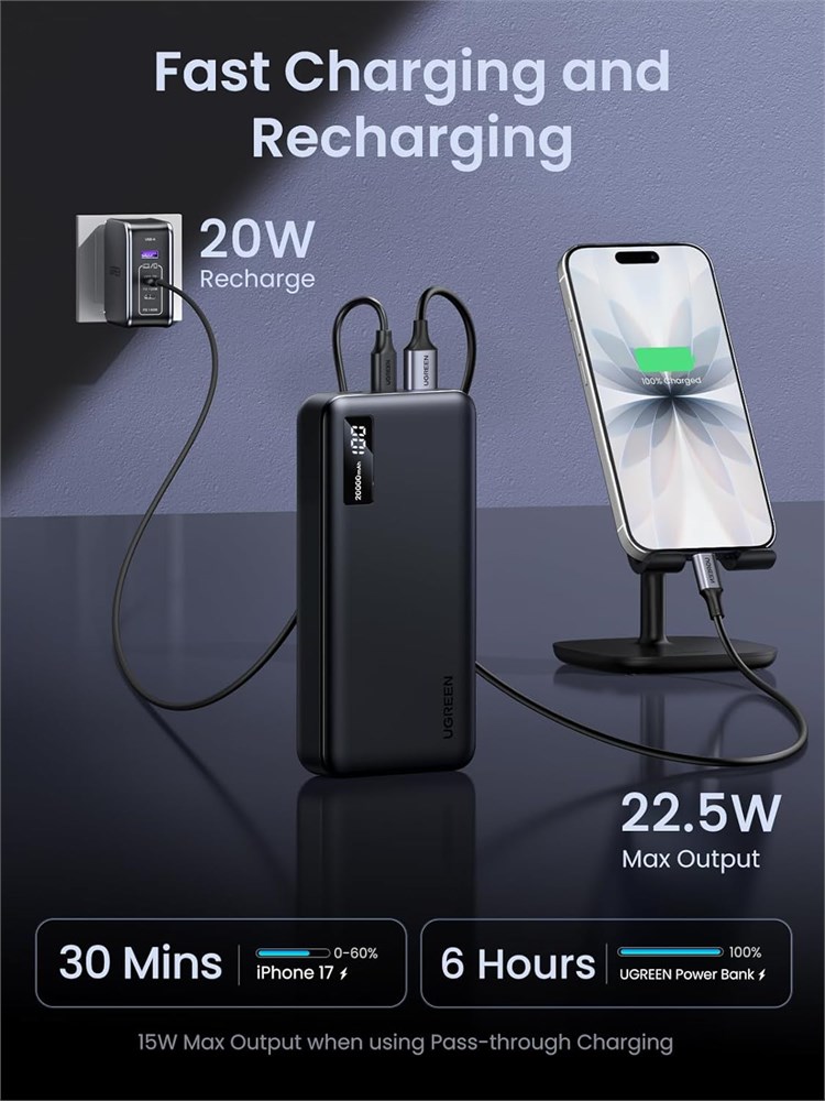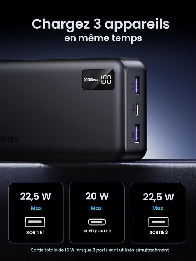 Charge volont : jusqu' 20 000 mAh de batterie vous permet de charger votre iPhone 15 Pro 4,5 fois, de sorte que vous n'avez jamais vous soucier de manquer d' nergie en d placement, excellent pour les voyages d'affaires et les trajets Charge rapide bidirectionnelle : le port de type C prend en charge une puissance de sortie maximale de 20 W, qui peut charger l'iPhone 15 Pro 60 % en 30 minutes, il prend galement en charge la puissance d'entr e maximale de 20 W, r duisant le temps d'attente pour l'entr e et la sortie Chargez 3 appareils simultan ment : ce chargeur portable USB C dispose de 2 ports USB A et 1 port de type C, qui peut alimenter 3 appareils en m me temps, plusieurs personnes peuvent partager l'alimentation sans faire la queue Chargement s r et rapide : la batterie externe UGREEN a pass la certification UL des normes de test d finies par Underwrite Laboratories Inc, la qualit est pass e et il n'y a pas de dangers cach s lors de l'utilisation Design compact : la capacit est la m me, mais la taille est plus petite, le poids de seulement 425,2 g le rend facile transporter lors de vos d placements, l' paisseur est d'environ 2,5 cm, et il peut tre facilement mis dans votre sac ou votre poche.
