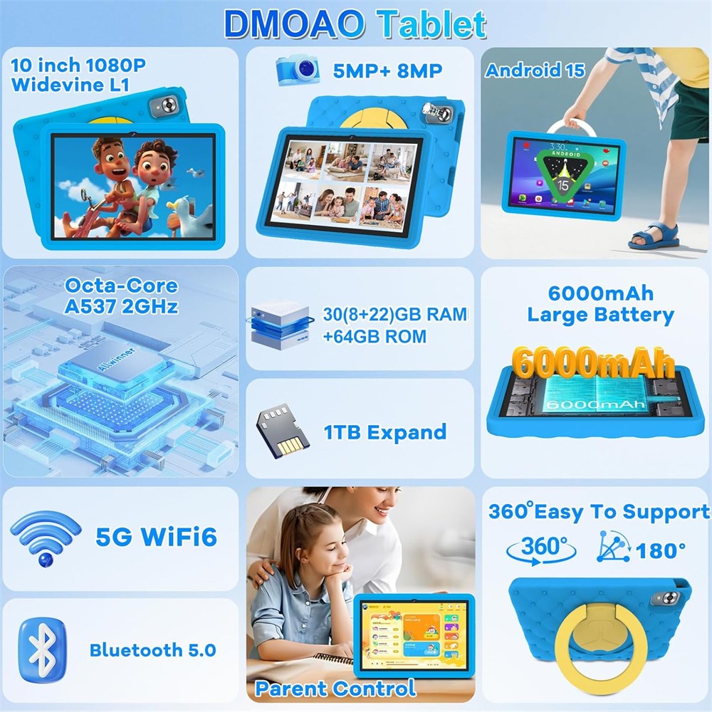 Newest Android 14 Operating System The Upgraded D3 tablet is equipped with the Android 14 system, comparing to 12 or 13, this tablet android is faster and more secure. It has been certified by play store, any apps in play store you can get easily, and applications can be distributed and managed on multiple screens, providing professional-level enjoyment. 18GB RAM + 128GB ROM + 1TB Expansion Android 14 tablet has 4GB RAM, which can be expanded up to 18GB in the settings. Whether you are playing a game or working on a task, the 10.1 tablet delivers a smooth experience. Equipped with 128GB ROM and MicroSD card slot (expandable to 1TB), you can store more of your favorite apps and content. (Not support add SIM card! !!) The 10 inch android tablet has a built-in 6000mAh battery up to 8 hours of usage, perfect for your daily commute, travel, and on-the-go entertainment needs. Widevine L1 Tablet / 10.1 IPS Screen This android tablet with a 10.1 inch display with a resolution of 1280*800, a golden display ratio of 16:10, and a 178 degree IPS wide viewing angle. 10 inch tablet is perfect for watching videos, browsing websites and comfortable nighttime reading. Widevine L1 compatible tablets show that you can watch Amazon Prime Video, Disney+, Hulu, etc. in high quality. (Netflix does not support HD playback) It also supports wireless projection, making it easy to connect to large TVs. Wi-Fi 6 / BT 5.0 / 8 Core CPU Tablet 10 inch supports AC dual-band Wi-Fi 6 and faster 5G frequency with network speeds up to 433Mbps. Bluetooth 5.0 provides high-fidelity connectivity with peripherals. Tablets offer faster data transfer speeds. Tablet android equipped with the newly introduced Allwinner A523 processor, designed with 8-core A55 architecture design. This is a significantly strengthened Octa-Core, achieving a performance increase of more than 6 times that of the A53. Full package Tablet with keyboard 2 in 1 Tablet contains all the accessories you need. This tablet package comes with bluetooth keyboard, Protective case, wireless mouse and charger, you don t need to waste time to purchase any accessory. Well design and slight body is a perfect choice for Christmas, and birthday.