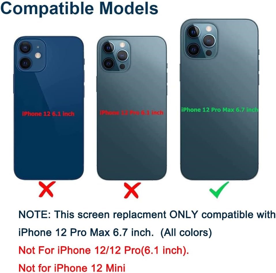 Uniquement pour iPhone 12 Pro Max cran de rechange (A2342, A2410, A2412, A2411) (6,7"). Veuillez ne pas l'utiliser sur d'autres mod les. Remplacez les probl mes de r ponse tactile, cass s, cass s, morts, endommag s, probl mes de mauvaise couleur, cran non fonctionnel, et rendez votre appareil neuf. Chaque kit est livr avec un assemblage de remplacement d' cran, des instructions et des outils de pr cision, mais il est pr f rable de se r f rer la vid o d'installation sur YouTube avant de l'installer. Test avant l'exp dition et fonctionne bien. Contenu : 1 cran de rechange pour iPhone 12 Pro Max, 1 kit d'outils de r paration, 1 joint tanche, 1 protecteur d' cran, 1 manuel d'instructions (fran ais non garanti)