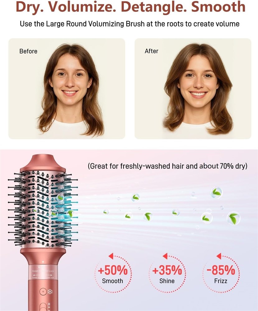 Comment mettre en place les accessoires et verrouiller? Veuillez regarder la vid o pour savoir comment ins rer les accessoires et les verrouiller? Veuillez ne pas tordre l'attachement mais tordre la base elle-m me (tournez la pi ce rose qui indique verrouillage par barillet rotatif) et ensuite l'attachement se verrouillera S che-cheveux haute vitesse 5 en 1 pour un coiffage rapide : Cet outil de coiffure a tout ce dont vous avez besoin pour presque tous les styles de cheveux. Le styliseur d'air pour cheveux comprend un s che-cheveux haute vitesse, 2 boucleurs air pour cheveux, une brosse volumisante, une brosse ronde pour boucles souples, et un sac de rangement pratique. Cet ensemble de coiffeur air aide lisser les frisottis et ajoute de la brillance - boucler, donner du volume ou lisser vos cheveux sans effort. Ensemble de brosses pour s che-cheveux s chage rapide : dispose d'un moteur sans balais de 110 000 tr/min et d'un flux d'air haute vitesse de 23 m/s pour un s chage rapide. Obtenez des r sultats de salon domicile en moins de temps avec moins de dommages dus la chaleur. Stylisateur intelligent air avec contr le de la chaleur/du vent : 3 modes de temp rature (54 C, 66 C et 88 C) et 3 r glages de vitesse du vent pour diff rents types de cheveux et pr f rences de coiffure, tout en assurant d excellents r sultats sans dommages caus s par la chaleur. Pour le curling, nous recommandons d'utiliser 88 C. Pour les cheveux fins, commencez avec 120 F ou 150 F. S che-cheveux air pour cheveux - Enrouleur d'air automatique : Livr avec 2 barillets de coiffure air de 1,25 pouces pour le coiffage des cheveux, un flux d'air directionnel pour enrouler les cheveux sans effort - sans pince ni chaleur extr me. Cr ez des boucles rebondissantes, volumineuses et naturelles en quelques minutes. Veuillez vous r f rer aux instructions incluses pour la premi re utilisation. Volume : Utilisez la brosse volumisante double brosse r duisant les frisottis aux racines pour cr er du volume et de la l g ret sans tirer ni emm ler, galement id ale pour les boucles l ches, le volume et les franges. (particuli rement id al pour les cheveux fra chement lav s et environ 70 % secs)