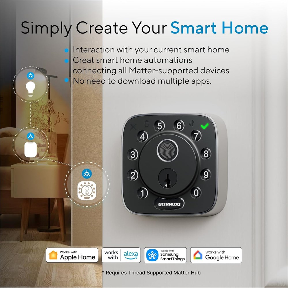 Int gration sans effort : d couvrez l'avenir de la connectivit de la maison intelligente ! Notre serrure intelligente Matter s'int gre parfaitement tous les cosyst mes compatibles Matter. Fonctionne avec Apple Home, Google Home, Amazon Alexa et SmartThings. Plus de probl mes de compatibilit Tranquillit d'esprit : prot gez votre maison avec un cryptage avanc et un design inviolable. Recevez des notifications en temps r el pour les activit s de porte et g rez l'acc s distance pour la famille et les invit s Plusieurs options d'acc s : d verrouillez votre porte comme vous le souhaitez en utilisant vos empreintes digitales, smartphone, clavier, cl physique. Profitez d'une entr e sans cl et d'un contr le d'acc s flexible S curit et intelligence am lior es : le verrou de porte intelligent se verrouille automatiquement lorsque la porte se ferme et se d verrouille lorsque vous vous approchez avec votre smartphone. Recevez des alertes pour les d verrouillages ou une porte ouverte. V rifiez l' tat de la porte avec le capteur. Partagez des cl s lectroniques ou des codes distance. Parfait pour les familles, Airbnb, appartements, bureaux et h tels Certifi BHMA : construit pour durer avec des mat riaux en alliage de zinc et un design r sistant aux intemp ries, assurant une performance fiable dans tous les climats Installation et configuration faciles : installez le verrou p ne dormant intelligent en quelques minutes avec nos instructions simples tape par tape, sans per age Plus une garantie m canique vie et une garantie lectronique de 18 mois. Assistance t l phonique en ligne vie du lundi au vendredi de 7 h 18 h PST et service apr s-vente 24h/24, 7j/7.