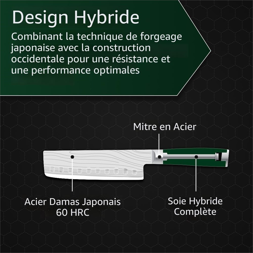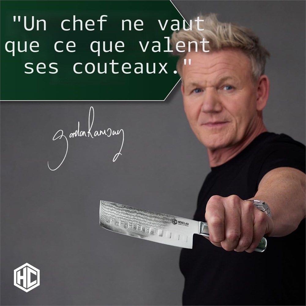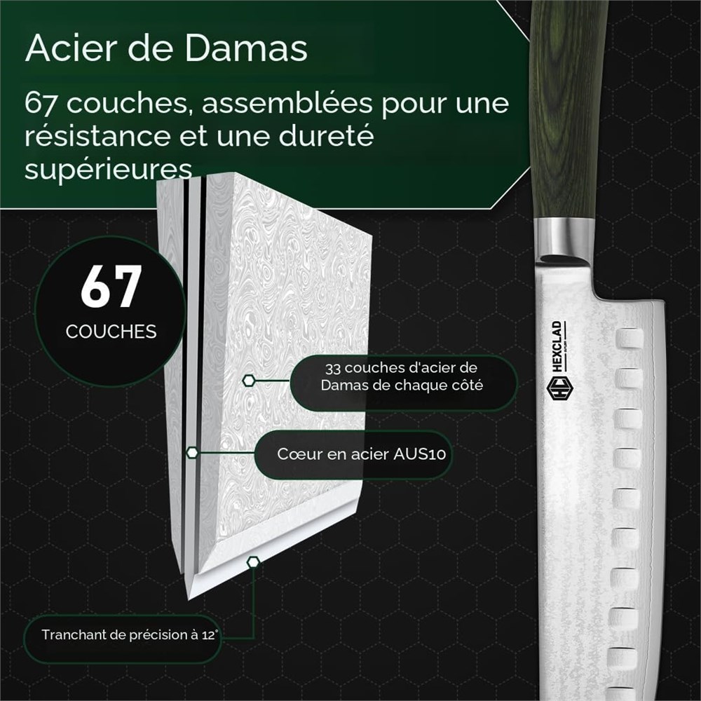 Tous les couteaux de cuisine HexClad sont des lames en acier de Damas japonais 67 couches avec des c urs de coupe construits en acier AUS-10 avec une duret Rockwell de 60 ou plus. Nos couteaux sont fabriqu s en utilisant la m thode Honbazuke en 3 tapes et un traitement thermique avanc pour am liorer la duret , la flexibilit et la r sistance la corrosion. Avec un entretien appropri , les couteaux HexClad dureront des g n rations. Les blocs de couteaux magn tiques permettent un rangement sans dommage. Veuillez ne pas utiliser le lave-vaisselle pour nettoyer votre couteau, un lavage la main avec un aiguisage fr quent est recommand . Comme HexClad est d vou la qualit et la perfection, notre produit est garanti 25 ans contre tout d faut de mat riaux et de fabrication. Ajoutez-le vos ensembles de couteaux de cuisine robustes pr f r s.