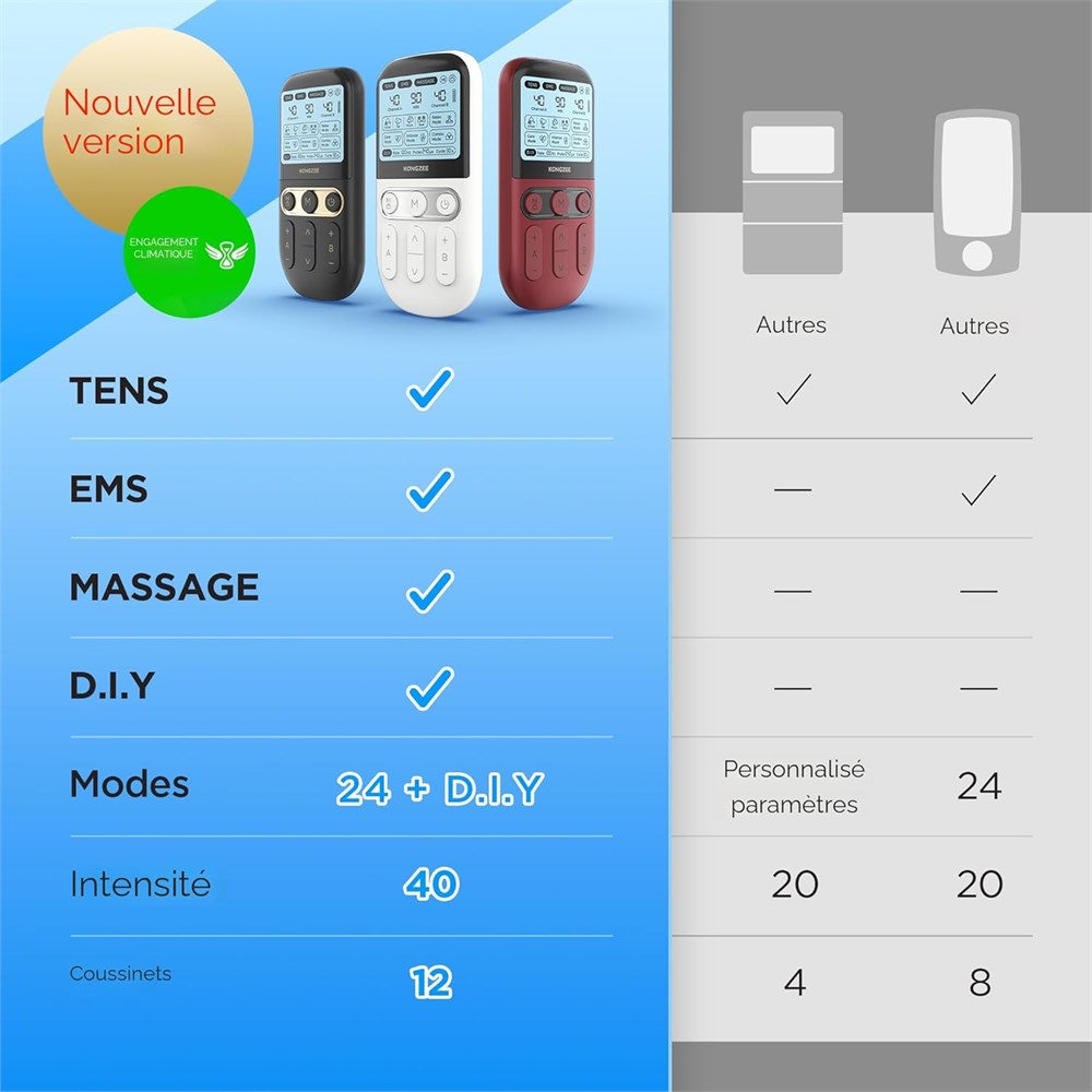 ***Lisez toujours l' tiquette et suivez les instructions d'utilisation*** Fonctionnalit innovante 4 en 1 : La marque Kongzee a eu des changes approfondis avec de nombreux utilisateurs de tens et a pass 2 ans d velopper la premi re machine tens fonction 4 en 1 sur le march . Par rapport aux appareils TENS sur le march , le produit est un m lange parfait de modes d'utilisation professionnels et personnalis s, permettant aux utilisateurs d'appareils TENS de r pondre une vari t de besoins diff rents avec une seule machine. lectrodes avanc es : Nos lectrodes de pointe, fabriqu es partir des derniers mat riaux, offrent un ajustement optimal la peau, procurant un toucher doux et respectueux de la peau pour un soulagement efficace de la douleur. Leur nature r utilisable ajoute la commodit , assurant une exp rience durable et confortable dans votre routine de gestion de la douleur faire soi-m me. Design exquis : avec son design dernier cri, notre appareil dispose d'une interface claire coupl e de puissantes fonctions. Avec plusieurs modes votre disposition, adaptez votre exp rience de massage pour correspondre vos pr f rences et d couvrez la technique qui convient le mieux vos besoins de soulagement de la douleur faire soi-m me. Alimentation sans effort : dites adieu aux tracas li s au remplacement de la batterie. Notre appareil est quip d'une batterie rechargeable, offrant une autonomie extra-longue pour une d tente et un soulagement ininterrompus dans votre r gime de soulagement de la douleur faire soi-m me. Forfait complet : Votre forfait complet comprend 1 unit TENS, 2 fils, 12 lectrodes, des plaques en plastique et un tui pratique - tout ce dont vous avez besoin pour une exp rience de stimulation musculaire TENS EMS DIY sans faille, adapt e vos objectifs de soulagement de la douleur.