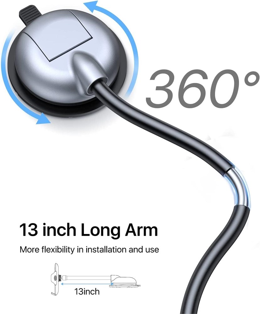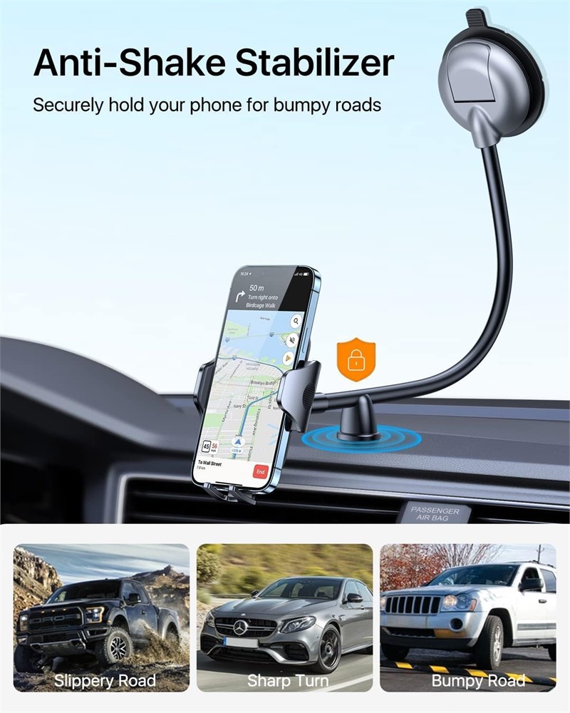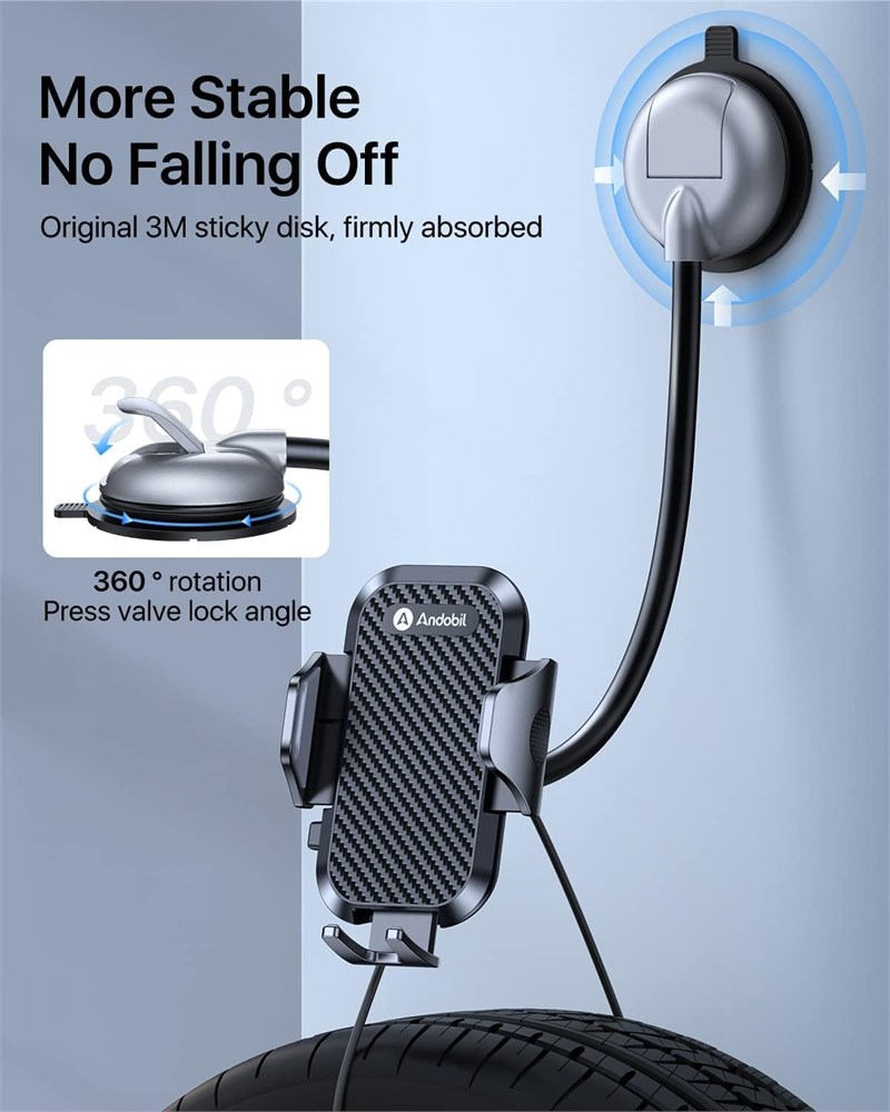 Super Stable Andobil car phone holder is made of high-quality German TPU, PU, PET materials to create three layers of nano-gel. Accommodates -4 F-215 F. This suction cup provides 65 lbs of suction for a firm grip on your windshield or dashboard! The included stabilizer reduces vibration while driving. Helps you conquer any terrain such as bumpy roads, potholes, rough mountain roads and more. (Note: The stabilizer is for one-time use only, it will lose its stickiness with repeated use.) 13-Inch Adjustable Gooseneck This car phone holder features a 13-inch aluminum gooseneck. You can flexibly change the shape of the car phone holder. Bend in any direction to avoid blocking your view for safety. Keeping your phone at your fingertips makes it easier to operate and safer to drive. Bidirectional 360 Rotation, Free Adjustment The chassis of this car mount realizes 360 free rotation. Without locking the suction cup, just rotate the bottom to adjust the angle. The panel joins the gooseneck with a round ball joint, allowing you to quickly switch between vertical and horizontal views. Easy to Operate and Sturdy Protection One-touch release button makes operation easier and more convenient. It ensures that you can quickly get your phone in and out of the car phone holder with one hand. Soft non-slip silicone pads are built into the feet and arms to provide a better grip and effectively prevent the phone from bumping, scratching, flying out, vibrating, etc. Universal Phone Holder The phone holder supports all 4-7 inch phones. The 1.12" deep clip arm and adjustable feet provide a firm grip on the thick case phone on rough roads. Fits perfectly even if you use a thick phone case. Compatible with iPhone series, Samsung series, LG series, Google series, etc.