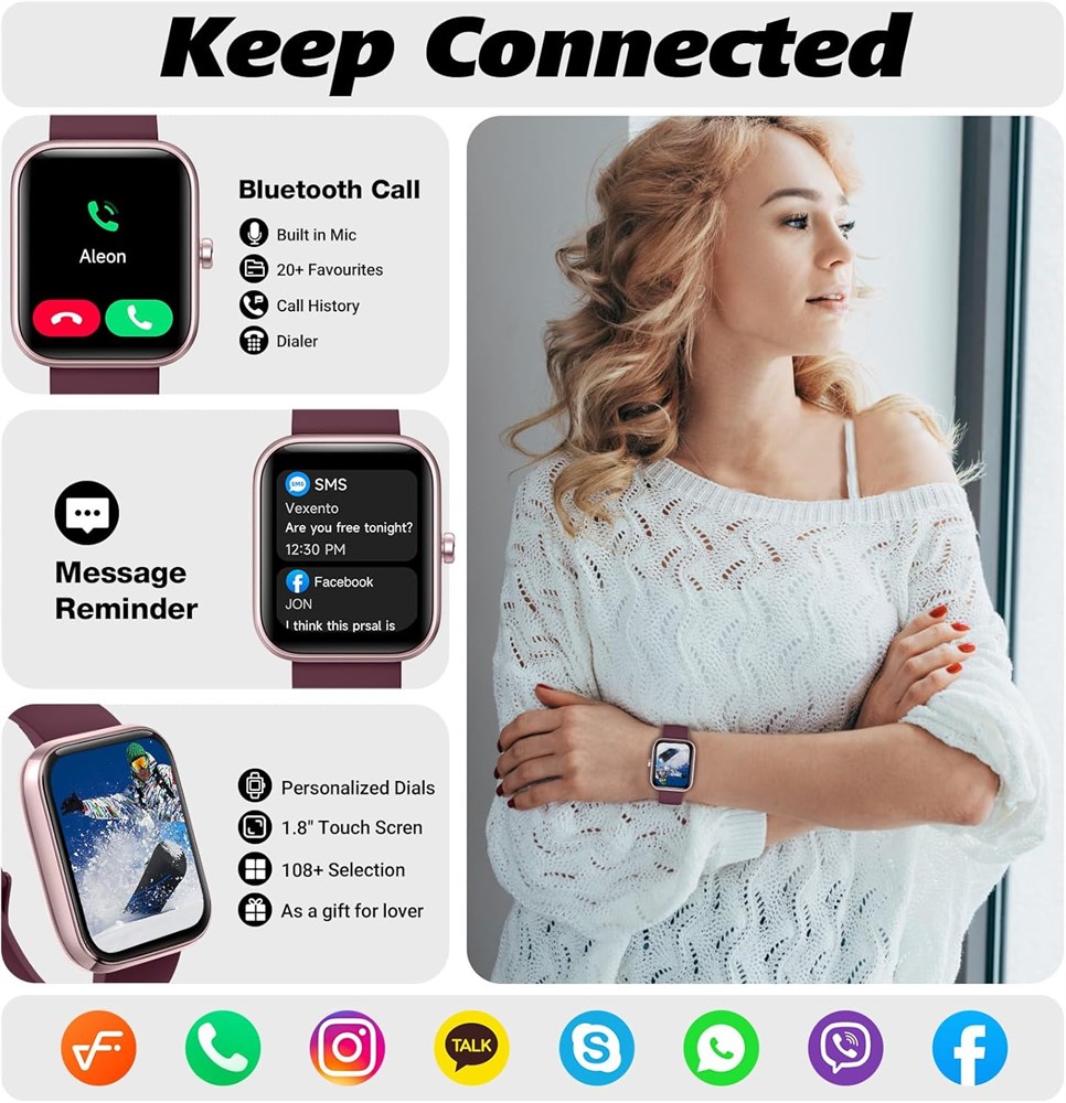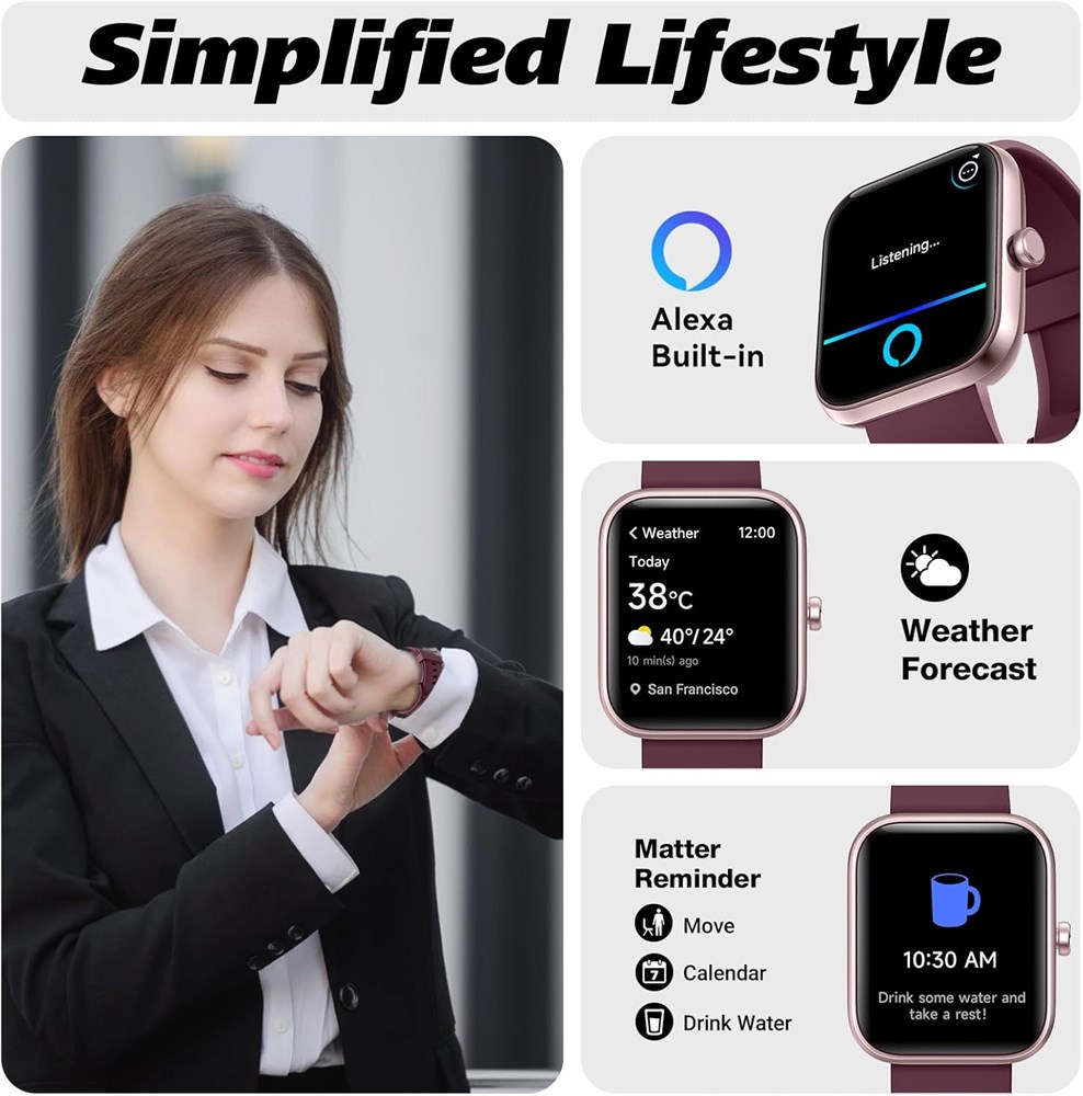 Bluetooth 5.3 Calling & Message Notifications: Make and receive calls directly from your wrist and easily check your call history. Stay connected wherever you go.Apple users can install the Veryfit app without any issues. If Android users can't download it from Google Play, they can download Veryfit Ultra instead. Whatever you do, don't download Veryfit Pro. 24/7 Health Monitoring & Alexa Built-in: Track key health metrics such as sleep quality, steps, distance, and calories burned all day, every day. Alexa support lets you check the weather, set reminders, and more using just your voice. 1.83-Inch HD Touchscreen & Custom Watch Faces: Enjoy a vibrant 1.83-inch full-touch HD display with smooth operation and crisp visuals. Personalize your watch with over 100 built-in faces or create your own using custom photos. 100+ Sports Modes & Smart Features: From running and cycling to yoga and beyond choose from over 100 ways to move! Stay connected with call/message alerts, check the weather, control your music, track steps, enjoy auto-brightness, switch languages easily, and splash through life with IP68 waterproof protection. IP68 Water Resistance & All-Day Battery Life: Splash-proof, sweat-resistant and rain-ready this watch keeps up with your daily routine. Ideal for workouts, hand washing and unexpected showers. Plus, its long lasting battery delivers reliable all day use without frequent recharging.Please note: To protect its lifespan, avoid swimming and hot water.