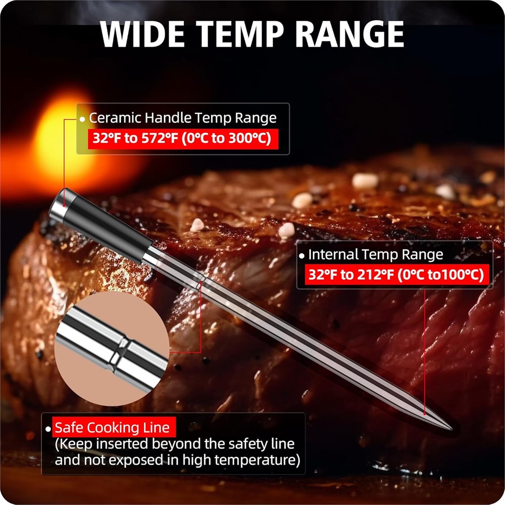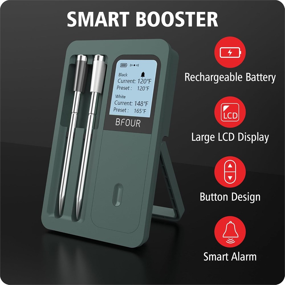 LCD Display Booster: Monitor real-time temperatures on the booster's large screen at any time without checking the app. It is visible, rechargeable and remotely controllable. Make cooking easier and more comfortable with this meat thermometer bbq. Highly Accurate Dual Meat Probes: Wireless bbq thermometer features dual black and white meat probes for easy identification; monitors internal cooking temperatures up to 212 F with 1.8 F accuracy. 100% Truly Wireless: The meat thermometers eliminates all tangled wires, allowing you to enjoy wireless freedom up to 328 feet/100 meters. The stylish army green color shows more quality and adds color to your home. Long Battery Life: The booster has 40 hours battery life, 2-min charge of Probe yields 60 hours of battery life. This smoker thermometers bluetooth is perfect for lengthy cooking sessions. Waterproof & Easy-to-Clean: The wireless meat probe is great for electric barbecues, smokers, ovens, grills, frying pans, or sous vide cooking, then simply clean the probes in the dishwasher. Intuitive Smart App: The user-friendly app includes 12 USDA presets or you can customize your own. It also offers a variety of alarm features such as target temperature alerts and pre-alarms, high/low temperature alarms, save alarm history and more. Wireless Thermometer Tips: Avoid temperatures above 212 F/100 C inside the probe to prevent damage; Insert the probe deep enough to cover the groove; The probe does not measure ambient temperature. What You Get: BFOUR BBQ Thermometer, 2 stainless steel probes, type-C cable, user s manual.