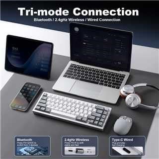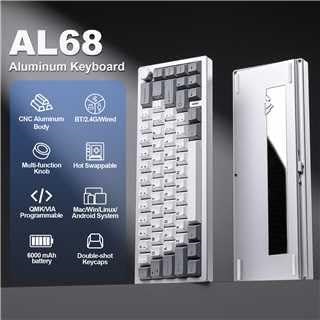 Aluminum Mechanical Keyboard:YUNZII AL68 aluminum keyboard is crafted from premium anodized aluminum for unparalleled durability and a superior typing experience. This 60% keyboard features 66 keys and a metal knob for easy volume and RGB control. The glossy back panel and corrosion-resistant design make it ideal for both gamers and professionals seeking a high-quality, long-lasting mechanical gaming keyboard Multi-Device Tri-Mode Wireless Connectivity: Stay connected across multiple devices with AL68. This wireless keyboard supports tri-mode connectivity Bluetooth, 2.4G wireless, and USB wired, making it compatible with Mac, Windows, Linux and more. Switch seamlessly between up to 5 devices, whether you re using a tablet, laptop, PC, or smartphone. Build-in 6000 mAh battery, enjoy up to 4 days of uninterrupted use when no RGB, making it the perfect companion for on-the-go productivity and gaming QMK/VIA Custom Keyboard: Unlock endless customization possibilities with the YUNZII AL68 s full QMK/VIA support. This programmable keyboard allows users to remap keys, create macros, and personalize backlighting with ease. Compatible with Mac, Windows, and Linux, this qmk/ via wireless custom mechanical keyboard is ideal for gaming and professional work. Take control of your keyboard layout and enjoy the ultimate in user-defined functionality Gasket Mount Creamy Keyboard: The hot swappable keyboard features a gasket mount structure that ensures vibration dampening and sound reduction, creating a comfortable and thocky typing. Compatible with both 3-pin and 5-pin switches, this keyboard comes pre-lubed switches and stablizers for a satisfying creamy sound. It features a Flex-Cut PC Plate and 4-layer sound fillingss, perfect for enthusiasts looking to customize their creamy keyboard with high-quality components South Facing RGB and Double Shot PBT Keycaps: YUNZII AL68 elevates your PC setup with its vibrant RGB backlighting and durable double shot PBT keycaps. The south-facing LEDs and cherry profile keycaps ensure a smooth, evenly distributed light effect, perfect for both gaming and work. With customizable lighting effects, this RGB keyboard adds a dynamic, colorful touch to any setup, enhancing both aesthetics and functionality.