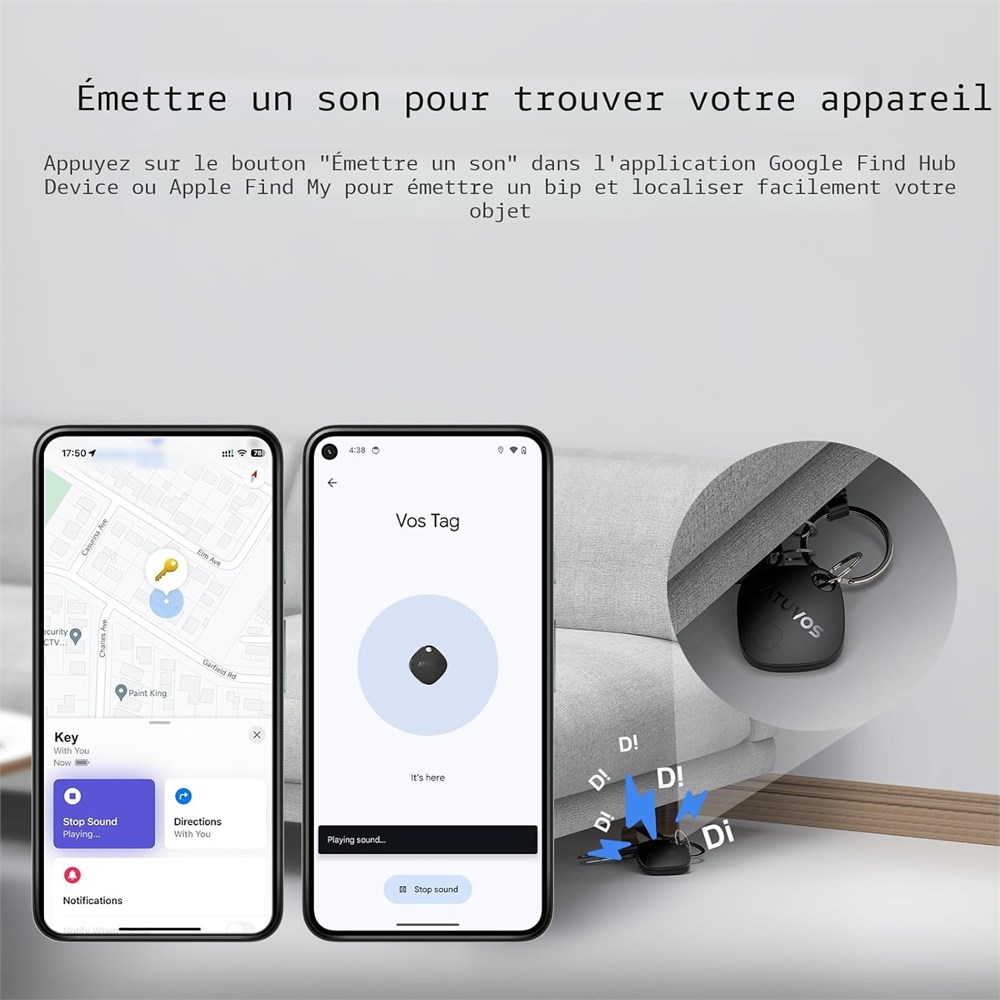 Outil de recherche d'articles pour iOS ou Android : ATUVOS Tag Pro est un tracker Bluetooth double syst me compatible avec iOS (via Find My App) et Android (via Google Find Hub), mais pas avec Huawei HarmonyOS. Bien que le ATUVOS Tag PRO dispose de puces certifi es par Apple et Google, en raison des limitations du syst me, il ne peut se connecter qu' un seul syst me la fois. Pour basculer entre iOS et Android, il suffit de d coupler le tracker et de le reconnecter au nouveau t l phone. Trouver proximit Fonctionne avec Google Find Hub ou l'application Apple Find My pour vous aider trouver vos affaires en faisant sonner votre tracker ATUVOS via le haut-parleur int gr (sonnerie forte, 80-100 d cibels), ou demandez simplement de l'aide Siri. (Remarque : pas de fonction UWB) Trouvez loin : le tracker d'air intelligent ATUVOS trouve des articles plus loin avec des centaines de millions d'appareils Android ou Apple dans le Google Find Hub ou le r seau d'application Find My . (Pas de frais mensuels ou annuels). Emplacement actuel : la port e Bluetooth du tracker Bluetooth ATUVOS peut atteindre jusqu' 60 m sans aucun obstacle. Lorsque la distance de suivi est au-del de la port e Bluetooth, vous pouvez utiliser le Google Find Hub ou l'application Find My pour localiser votre ATUVOS sur une carte et m me activer la navigation pour vous guider vers son voisinage. Mode rappel et perte laiss e : vitez de perdre vos effets personnels en premier lieu avec des alertes instantan es via l'application Apple Find My . (Les syst mes Google n'ont pas encore rendu cette fonctionnalit disponible). Si la balise de localisation ATUVOS est perdue, activez le mode Perdu dans Google Find Hub ou Apple Find My et vous serez automatiquement averti lorsqu'il est d tect par le r seau Find My d'Apple. Protection de la vie priv e : pour des raisons de confidentialit , le Google Find Hub ou le r seau d'application Find My est crypt et anonyme, et les donn es de localisation et l'historique ne sont pas stock s sur l' tiquette ATUVOS Tracker. tanch it IP67 et batterie rempla able : le porte-cl s ATUVOS est la fois r sistant l'eau (avec un indice IP67) et durable. Il est aliment par une pile bouton CR2032 avec une dur e de vie de plus de 1 an. Lorsque la batterie est faible, le d tecteur d'articles ATUVOS vous avertira de la remplacer. Partager cet article : la nouvelle fonctionnalit des appareils Android ou iOS 17 vous permet de partager votre tiquette de suivi d'air avec jusqu' 5 participants dans le Google Find Hub ou l'application Find My , leur permettant de voir l'emplacement de l'article sur la carte. (Veuillez vous assurer que votre appareil iOS est mis jour vers iOS 17) Utilisations multiples et service client le : les localisateurs d'articles ATUVOS vous aident suivre vos bagages, cl s, valises, portefeuilles, sacs, voitures. Excellent cadeau pour votre famille lors des anniversaires, No l et toute autre f te. Nous avons un service client 24 heures sur 24, si vous avez des questions sur l'utilisation du localisateur d'articles ATUVOS , n'h sitez pas nous contacter pour r soudre le probl me pour vous.