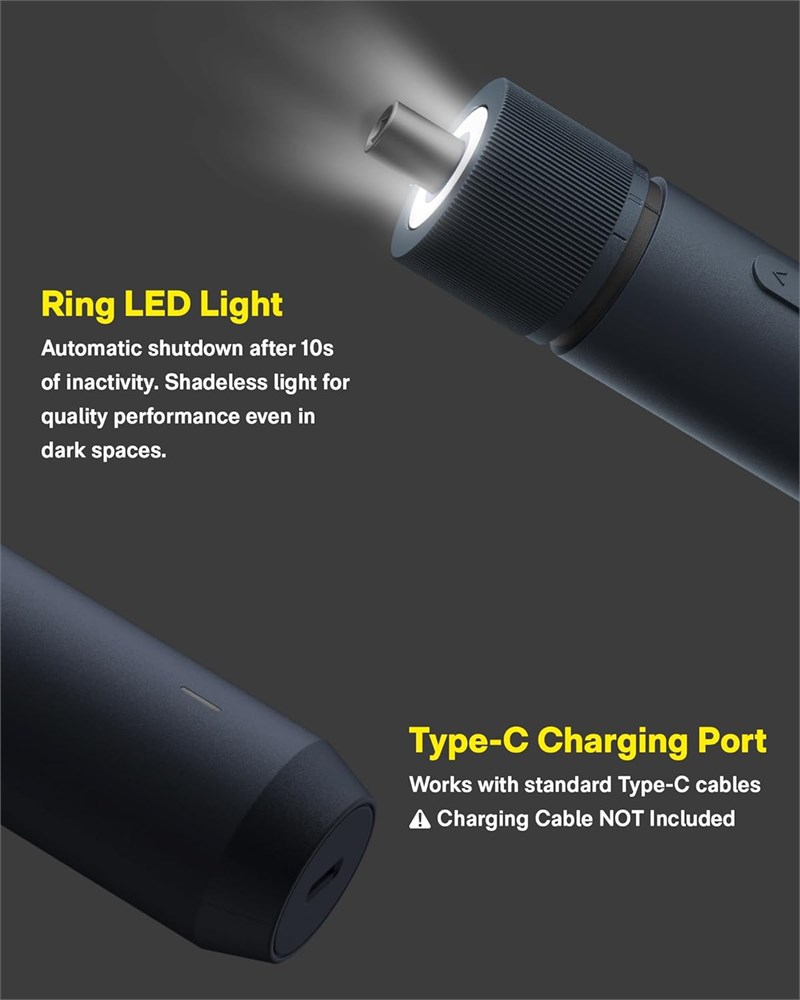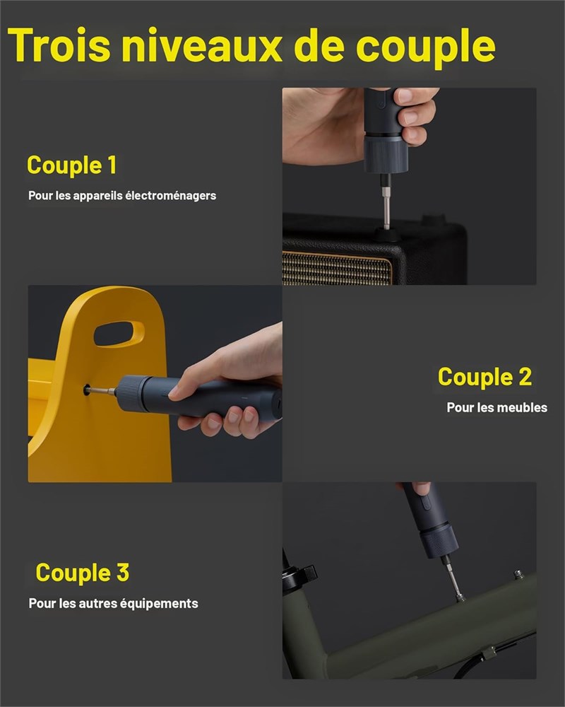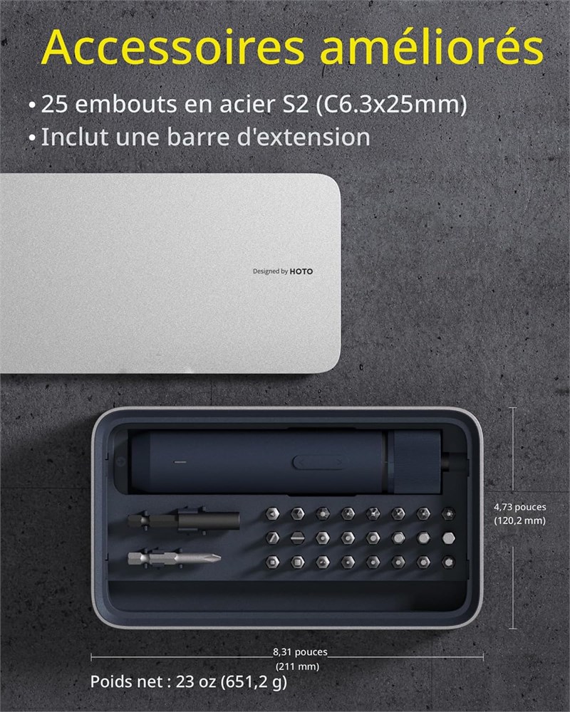 Remarque : veuillez charger compl tement le tournevis lectrique avant la premi re utilisation. Bas sur le m canisme de protection de la batterie 0 V inhibition de charge, veuillez ne pas laisser la machine d charg e plus de 3 mois. Design tout-en-un : le jeu de tournevis lectriques HOTO comprend 9 types de 25 embouts en acier S2, chacun avec une duret allant jusqu' 60HRC. Ils sont stock s dans la bo te de rangement magn tique en plastique de haute qualit , et le design tout-en-un est tr s pratique transporter. Fonctionnement sans effort : le tournevis sans fil est quip d'un bouton de d vissage et d'un bouton pour 3 r glages de couple, assurant une force de couple pr cise (mode lectrique : max 4 N m, mode manuel : max 8 N m). Rel chez le bouton pendant 10 secondes avant de l' teindre. Minimaliste & Puissant : la capacit de la batterie de 1500 mAh, qui a subi un processus rigoureux de test de batterie en 37 tapes, offre une endurance tendue, lui permettant de conduire plus de 800 vis sur une seule charge compl te (temps de charge : < 150 minutes). Design ergonomique : le poids de la visseuse sans fil est de seulement 0,2 kg et dispose d'une poign e souple double couche en caoutchouc TPE, qui peut tre utilis e d'une seule main. Lorsque vous travaillez dans des zones sombres, changer la lampe LED sans ombre peut am liorer la visibilit . Contenu de l'emballage : 1 tournevis lectrique, 1 x 25 embouts (C6,3 x 25 mm) : fente (SL4/SL6), Phillips (PH1/PH2/PH3), hexagonal (H2/H2.5/H3/H4/H5/H6), Torx (T9/T10/T15/T20/T25), Pozidriv (PZ1/T25). PZ2), carr (S1/S2), Triangle 2.3, Cl 2.6, Tri-Wing TW1, (C6.3x50mm) : Phillips (PH2), 1 x Barre d'extension de 60 mm, 1 x Bo te de rangement, 1 x Manuel de l'utilisateur (fran ais non garanti). (Remarque : le c ble de charge n'est pas inclus)
