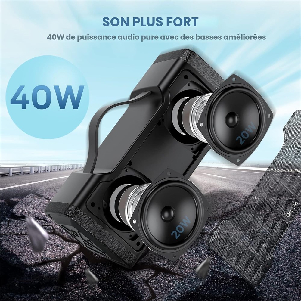 Son tonnant de 40 W : le haut-parleur Bluetooth Oraolo est con u avec une configuration de deux haut-parleurs de 40 W avec des p riph riques de sortie audio st r o puissants qui peuvent jouer parfaitement sans distorsion, m me un volume maximum. Le dernier pilote st r o peut garantir des basses et des m diums plus pr cis. La qualit sonore choquante rend ce haut-parleur Bluetooth Oraolo plus fort id al pour une utilisation en int rieur et en ext rieur. 24 heures de jeu Fournit une lecture continue sur 24 heures. Pas besoin d'arr ter l'enthousiasme en chargeant le haut-parleur au milieu de la r union. Tant que la f te continue, ces haut-parleurs Bluetooth sans fil continuent de chanter. Lorsque la foule rejette, chargez ce haut-parleur de 40 W compl tement dans les 3 heures. Structure tanche IPX6 : les haut-parleurs portables Oraolo offrent une forte protection tanche. La coque en silicone durable et le couvercle du port offrent au haut-parleur une meilleure protection interne, permettant une utilisation dans une vari t d'environnements diff rents. Pr vention des chutes Le haut-parleur sans fil Oraolo utilise un mat riau ABS de qualit sup rieure pour se prot ger contre les chocs, assurant ainsi qu'il ne sera pas endommag en cas de chute d'une hauteur de 0,9 m (test en laboratoire). La grille m tallique peut prot ger facilement le haut-parleur et garantir que la qualit sonore n'est pas endommag e. Id al pour les voyages, le camping et les aventures en plein air. Connexion sans effort : gr ce la technologie Bluetooth 5.3 et la derni re puce Bluetooth ATS, ce haut-parleur Oraolo se connecte via Bluetooth en quelques secondes l'iPhone, iPad, smartphones, tablettes, Windows et autres appareils Bluetooth. Il peut garantir la transmission de qualit sonore la plus parfaite dans un environnement sans barri re, sans distorsion et sans retard de lecture. Contenu : haut-parleur Bluetooth Oraolo plus fort, c ble de charge USB-C, c ble audio auxiliaire et manuel de l'utilisateur (fran ais non garanti). Notre service client vie rend votre achat absolument sans risque. Si vous avez des questions, n'h sitez pas nous contacter, nous vous fournirons un service de qualit dans les 24 heures.