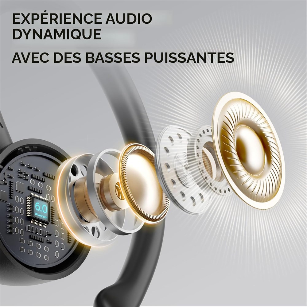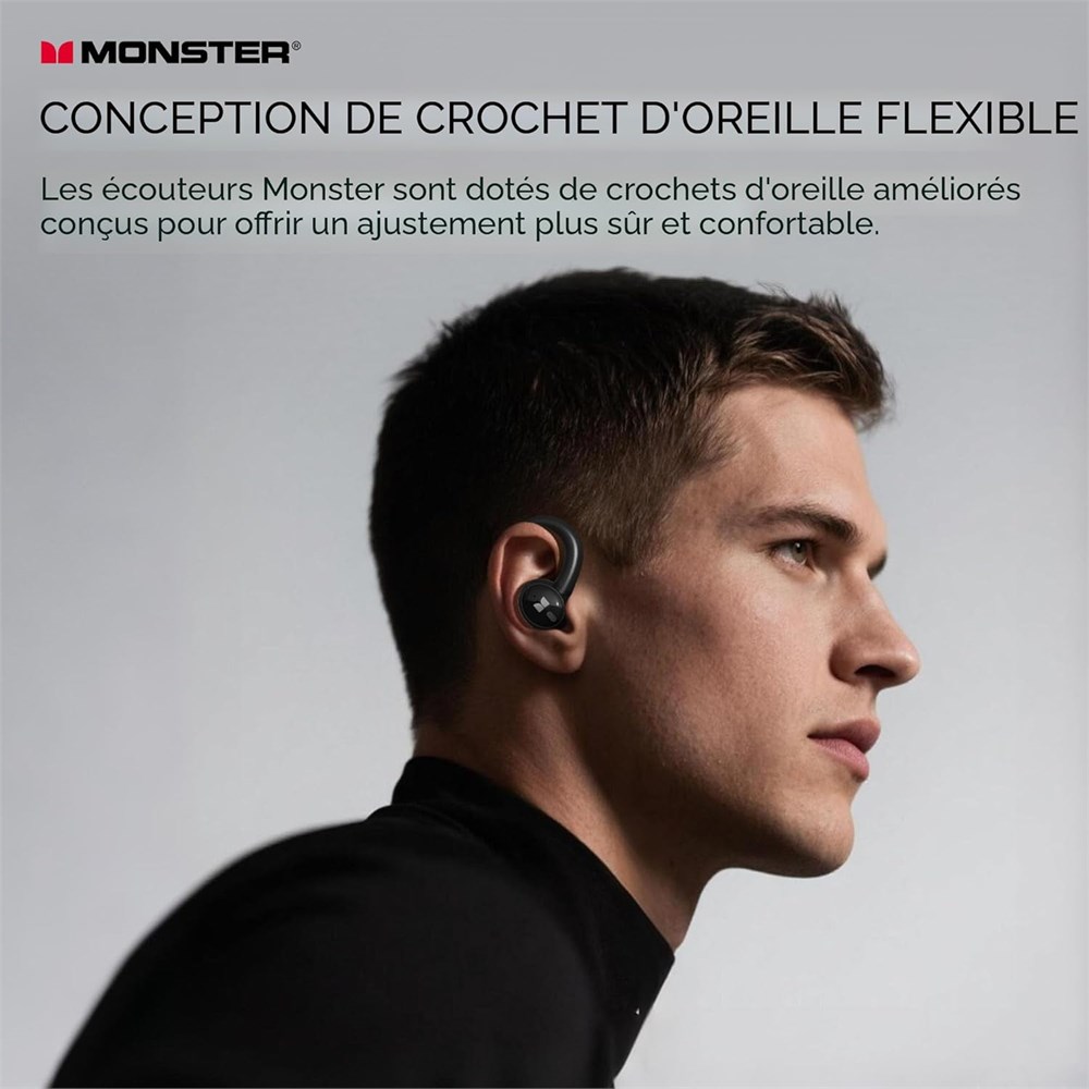 Crochets d'oreilles de sport confortables, tanch it IP-X6 : les couteurs sans fil adoptent un design ergonomique de crochet d'oreille, offrant une exp rience de port stable, toujours confortable. Le crochet d'oreille est fabriqu en silicone souple, antid rapant l'oreille, vous permettant de profiter d'un festin auditif sans stress pendant un port long terme. Les couteurs Bluetooth sans fil sont quip s de la technologie d' tanch it IPX5, ce qui peut pr venir efficacement les dommages caus s par les claboussures caus es par la sueur et les gouttes de pluie, en particulier pour l'entra nement, la course, la salle de sport. Appariement rapide et large compatibilit : avec la technologie avanc e de puce Bluetooth 6.0, le casque sans fil Monster N-Lite 216 prend en charge HFP A2DP HID AVRCP, qui offre un appariement instantan et une transmission stable sans interruption, avec une distance de connexion stable allant jusqu' 15,2 m. Au moment o vous ouvrez la coque, les couteurs s'appairent instantan ment et sans effort votre appareil pr c demment connect , vous vitant les tracas de l'appariement manuel et de longues temps de connexion. couteurs antibruit ENC et st r o immersive : profitez d'un son de qualit sup rieure avec des basses profondes puissantes et des aigus nets, con us pour vous garder motiv . Le casque Bluetooth dispose d'un microphone int gr haute performance ENC antibruit qui garantit des appels cristallins en r duisant le bruit de fond, m me dans des environnements occup s comme la salle de sport ou en d placement. 48 heures de lecture et double affichage LED : les couteurs de course offrent jusqu' 8 heures d'utilisation continue sur une seule charge, l' tui de charge portable peut charger les couteurs 3 fois. Que ce soit sur la route ou dans la vie quotidienne, il offrira une commodit in gal e et une exp rience intelligente. Le double affichage LED sur les couteurs affiche avec pr cision la puissance restante du bo tier de charge et la progression de charge des couteurs sans fil. Avec une charge rapide de type C, il ne faut que 1,5 heure pour charger la coque.