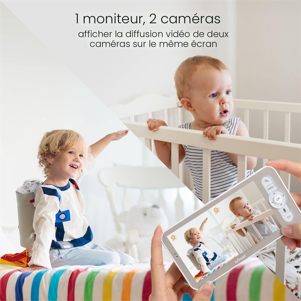 Clarification de l'alimentation - savoir avant d'acheter : le moniteur (unit parentale) est aliment par une batterie rechargeable pour une utilisation flexible et sans fil. Cependant, la cam ra n cessite une alimentation constante via l'adaptateur secteur fourni et doit tre branch e sur une prise. Remarque : la cam ra n'est pas aliment e par batterie, assurant une surveillance vid o et audio stable 24h/24, 7j/7. Deux options de connexion : sans Wi-Fi et avec Wi-Fi la maison, utilisez l' cran LCD HD de 5 pouces/sans r seau dans une port e de 300 m tres pour surveiller. Lorsque vous tes en d placement, il suffit de surveiller et de contr ler distance les cam ras avec l'application mobile. (les cam ras doivent tre connect es au m me r seau 2,4 G que l'application mobile lors de la premi re configuration) ieGeek 1T peut tre utilis avec un moniteur ou tout simplement par t l phone, vous aide garder un il sur votre petit tr sor, peu importe o vous tes ou ce que vous faites. Double cam ra et cran partag : le ieGeek Baby 1T est quip de 2 cam ras HD et d'une fonction cran partag , ce qui vous permet de placer chaque cam ra diff rents endroits mais de les surveiller et de les contr ler sans effort partir du m me cran. Gr ce la batterie de grande capacit de 3000 mAh, l' cran dure 7 11 heures en mode lumi re constante, 6 jours en mode veille. Lorsque vous souhaitez profiter de moments de tranquillit dans le jardin, vous pouvez surveiller vos enfants tout moment sans vous soucier de la port e de l alimentation et du signal. Entretien intelligent D tection de mouvement/bruit/pleur La cam ra de surveillance pour b b a une d tection de mouvement/bruit/pleurs. La d tection de mouvement vous permet de capturer intelligemment chaque mouvement de votre b b , l'emp chant de faire des actions dangereuses comme grimper hors du berceau. La d tection sonore et la d tection des pleurs vous lib rent des m thodes traditionnelles de soins de b b , vous donnant plus de temps pour d'autres activit s, telles que regarder des films ou lire des magazines. R solution 2K de haute qualit et suivi automatique 360 : avec le dernier capteur CMOS haute performance, la r solution de la cam ra est jusqu' 2K, et vous pouvez obtenir des images super claires de votre b b la fois pendant la journ e et la nuit. Les cam ras pour b b prennent en charge la fonction PTZ Pan/Tilt, qui peut pivoter 355 horizontalement et 60 verticalement. Vous pouvez contr ler manuellement la vision de la cam ra vid o pour b b , ou activer la fonction de d tection humaine, puis la vision de la cam ra suivra automatiquement votre b b . Plus de fonctionnalit s, plus de soin D tection de temp rature et d'humidit , zone d'alarme personnalis e, mode VOX, berceuses douces, rappel d'alimentation, lecture vid o, carte m moire et stockage cloud, partage multi-utilisateurs, connexion ONVIF, etc. Ce moniteur pour b b avec cam ra et audio rend tout plus scientifique et pratique.