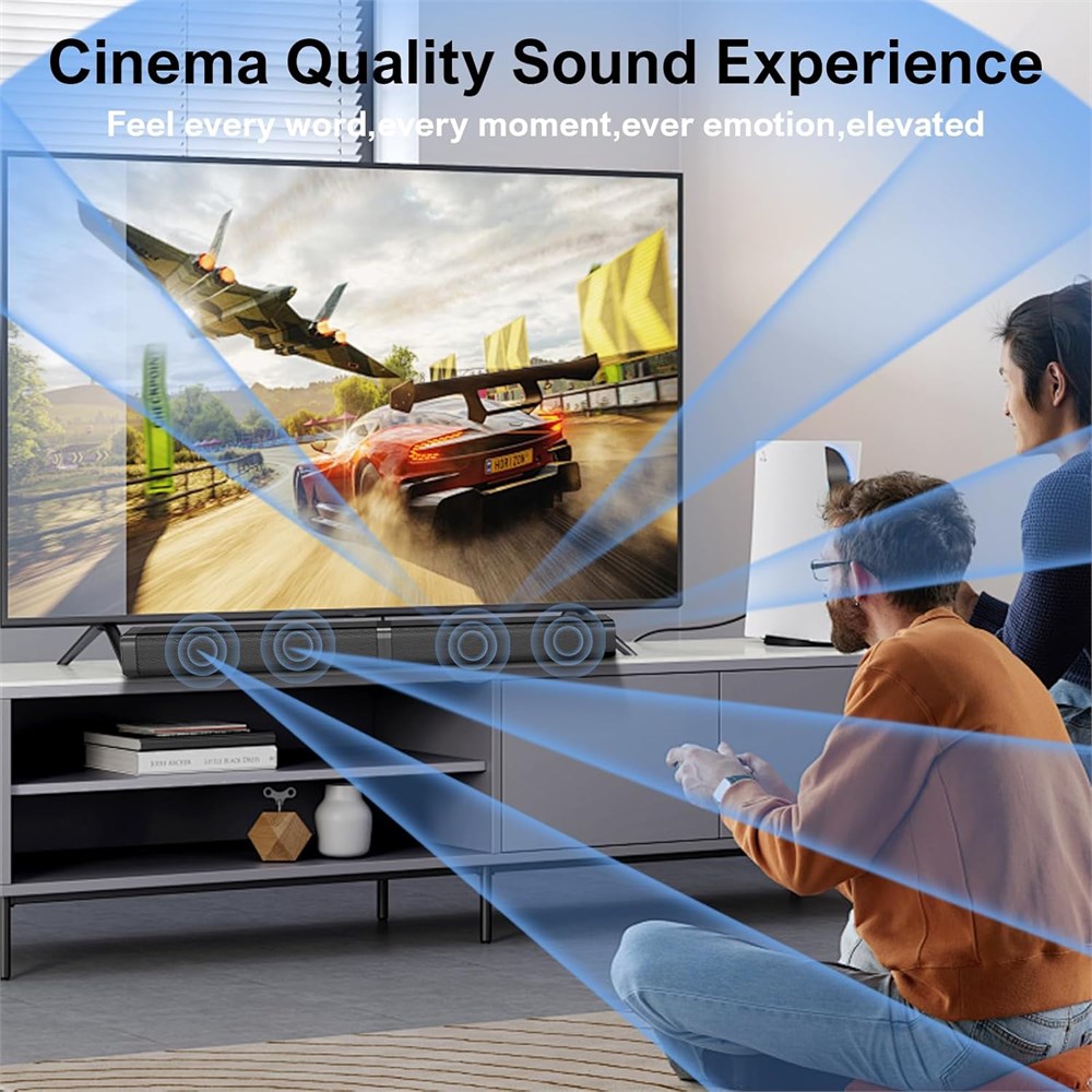Barre de son surround st r o : haut-parleurs puissants de 80 W qui vous offrent non seulement d'excellents sons st r o, mais aussi des basses puissantes qui remplissent la pi ce sans distorsion. Son Surround, coutez de la musique comme s'il s'agissait d'un concert. Profitez d'un son st r o la maison. Barre de son au design l gant : la barre de son offre une combinaison parfaite pour votre appareil de lecture domestique, en particulier pour la TV. La barre de son peut tre d mont e 1 2 pour tre plac e des deux c t s de la t l vision ou sur le mur pour se connecter avec des accessoires de base, profiter d'un son combin vertical ; ou combiner 2 en 1 plac sur la table ou mont sur le mur pour s'adapter votre espace de divertissement. T l commande ou bouton de contr le du haut-parleur : le haut-parleur Bluetooth offre un contr le un seul bouton de haute qualit et pratique et une double op ration de contr le distance. La t l commande haute sensibilit affiche diff rents modes gr ce aux lumi res LED. Apportez des basses profondes votre t l viseur intelligent et votre maison douce. Configuration rapide de la barre de son : connectez des appareils Bluetooth tels que votre smartphone ou votre tablette la barre de son en une simple configuration en 3 tapes. Connectez la barre de son d'autres appareils via la connexion HDMI/optique/AUX 3,5 mm Line-In pour ces appareils sans Bluetooth. En utilisant le c ble fourni, vous pouvez rapidement configurer la barre de son sur votre t l viseur. Ce que nous offrons : nous offrons un support technique complet pour chaque produit, qui comprend galement un service client complet 24 heures sur 24 et une assistance par e-mail. Comprend un haut-parleur TV, une t l commande, un adaptateur d'alimentation, un manuel de l'utilisateur (fran ais non garanti), un c ble HDMI/optique/RCA/AUX, un support.